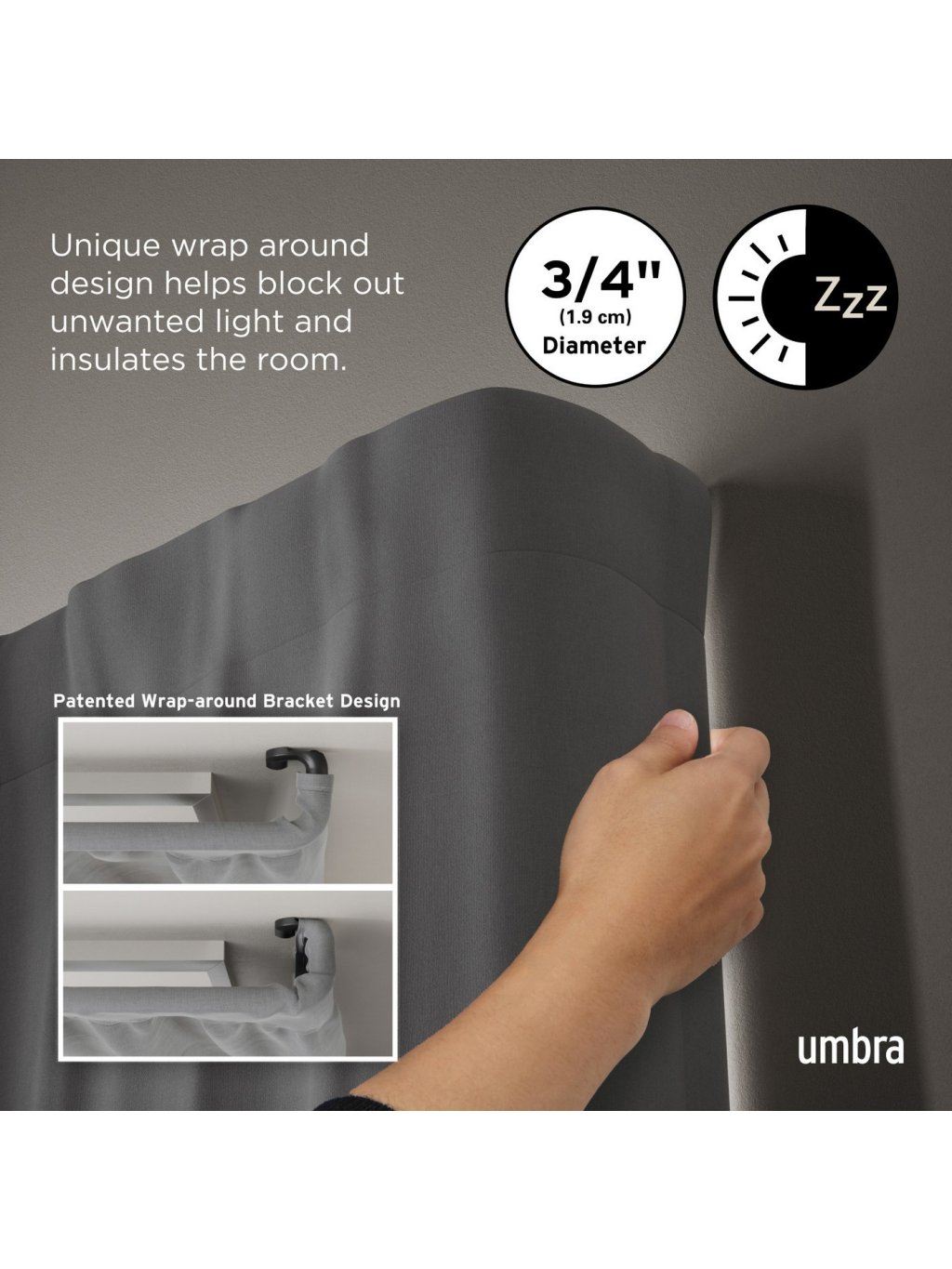 Umbra Twilight garniža je múdre riešenie, ak chcete obmedziť prenikanie svetla do miestnosti. Vďaka špeciálnym koncovkám, ktoré vedú záves tesne pozdĺž steny, efektívne blokuje lúče svetla po stranách. Minimalistický dizajn sa hodí do každého interiéru a teleskopická konštrukcia umožňuje ľahké prispôsobenie šírke okna.