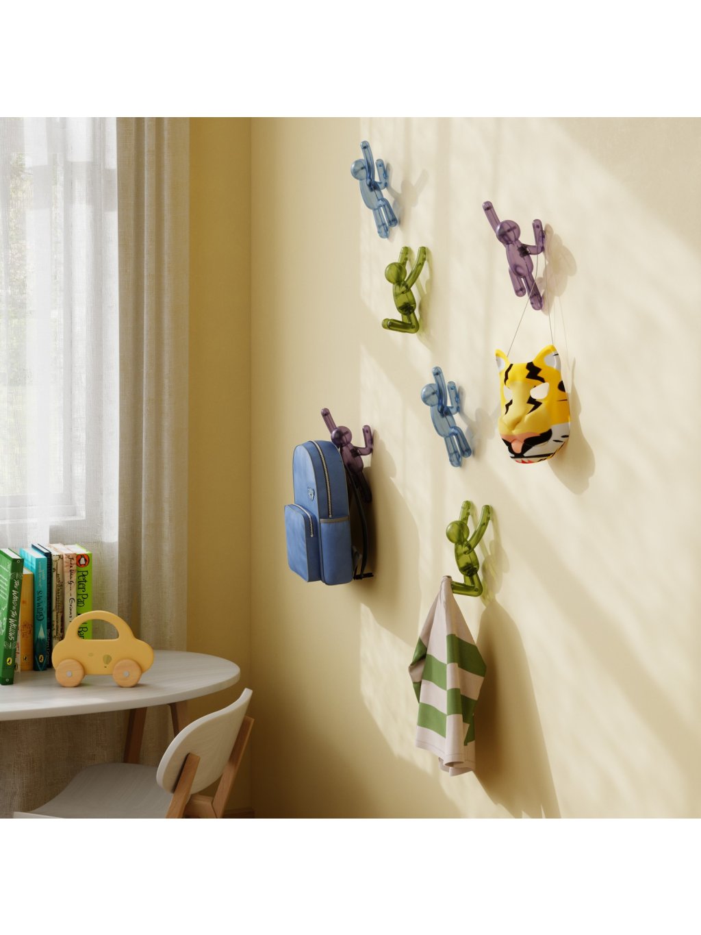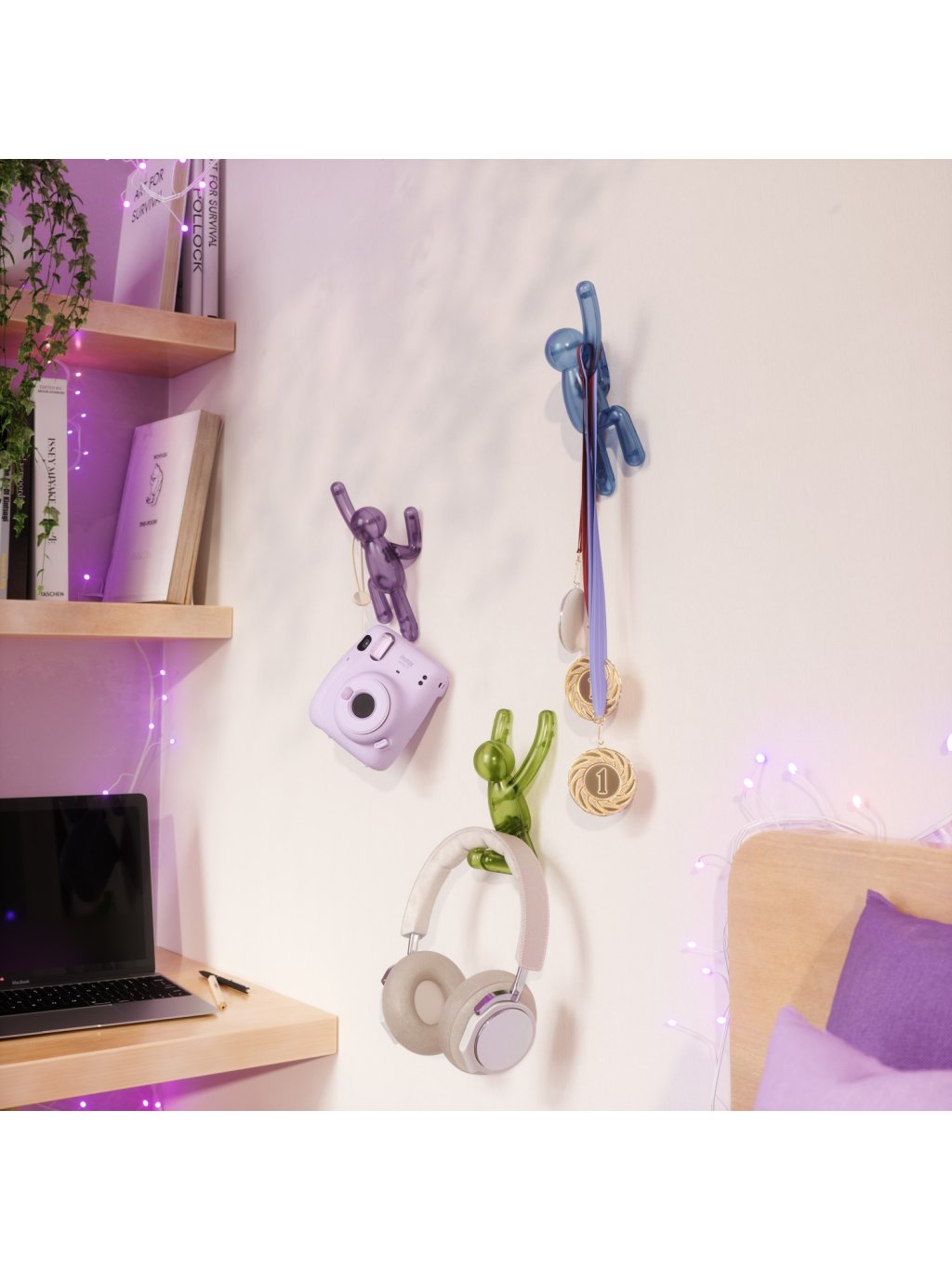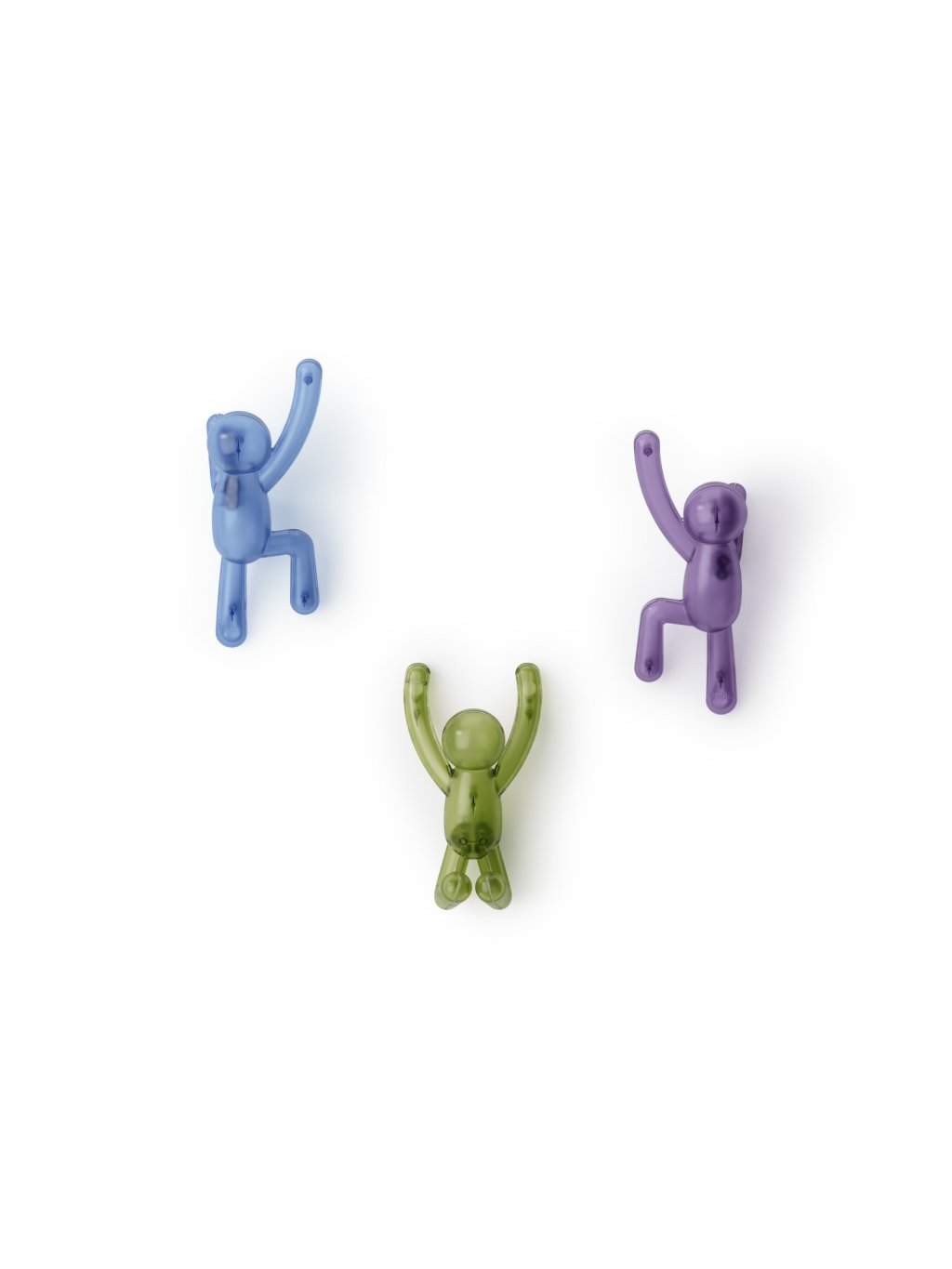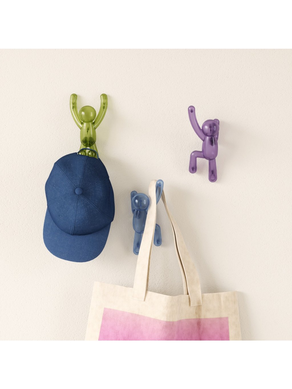 Umbra Buddy Wall Hooks sú originálne nástenné háčiky , ktoré kombinujú zábavu, štýl aj praktickosť. Postavičky Buddy „šplhajúce po stene“ nielen rozveselia priestor, ale tiež poslúžia ako funkčné vešiaky pre oblečenie, tašky, uteráky či doplnky. Každý háčik unesie až 2,3 kg (5 lbs) a vďaka pevnému uchyteniu na stenu je ideálny do predsiene, kúpeľne, detskej izby alebo kancelárie. Pokiaľ sa práve nepoužívajú, zostávajú štýlovým dizajnovým doplnkom, ktorý okamžite zaujme každého návštevníka. Vyrobené z recyklovaných plastov .