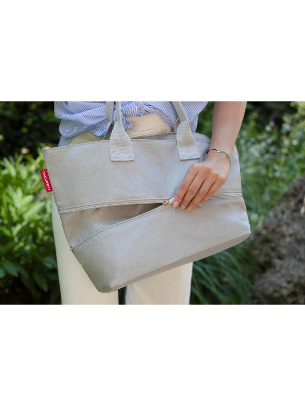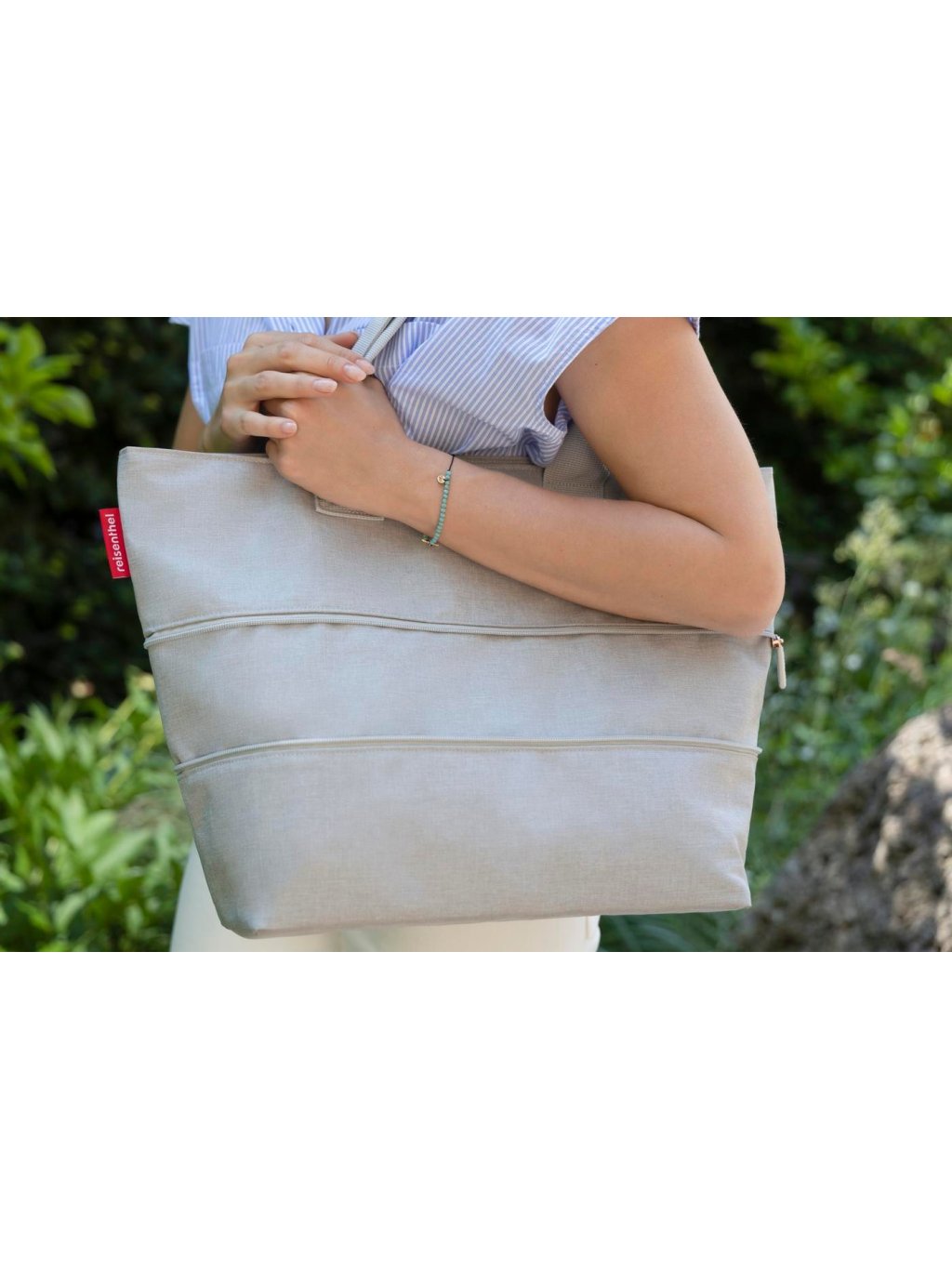 Nákupná kabelka = taška na nákupy Shopper e1 od Reisenthel je pripravená pojať menšie nákupy do objemu 12 l alebo 18 l po úplnom rozložení. Kabelka, taška na nákupy Shopper e1 má vnútorné vrecko na zips. Túto tašku módnu tašku môžete nosiť v ruke aj cez rameno, vždy v dvoch možných veľkostiach. Geniálny zips po strane kabelky Shopper zvýši objem tašky na 18 l.