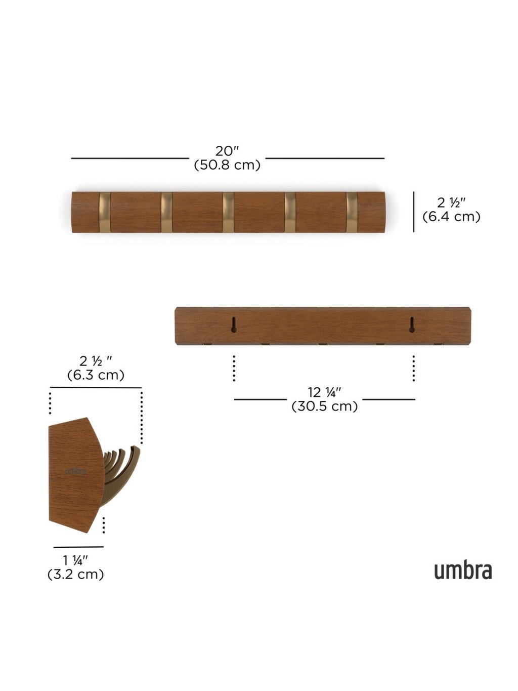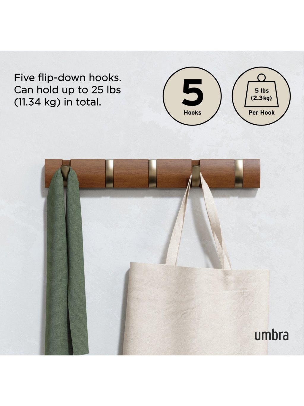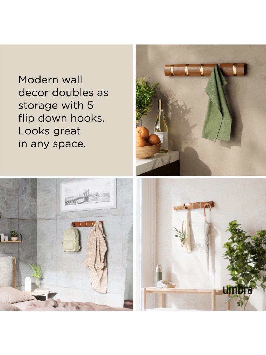 Umbra Flip Hook 5 je moderný nástenný vešiak so šikovným systémom výklopných háčikov, ktoré sa po použití elegantne zasunú späť do lišty. Vďaka tomu pôsobí minimalisticky a šetrí priestor – ideálna voľba do predsiene, spálne, kúpeľne alebo kancelárie. Každý háčik unesie až 2,3 kg (5 lbs) a poskytne dosť miesta pre kabáty, tašky, šály aj doplnky. Flip sa vďaka svojmu nadčasovému vzhľadu a skrytému uchyteniu na stenu stane praktickým aj dekoratívnym doplnkom vášho interiéru. Vyrobený z kvalitného dreva s prirodzenou kresbou, ktorá dodáva každému kusu osobitý charakter.