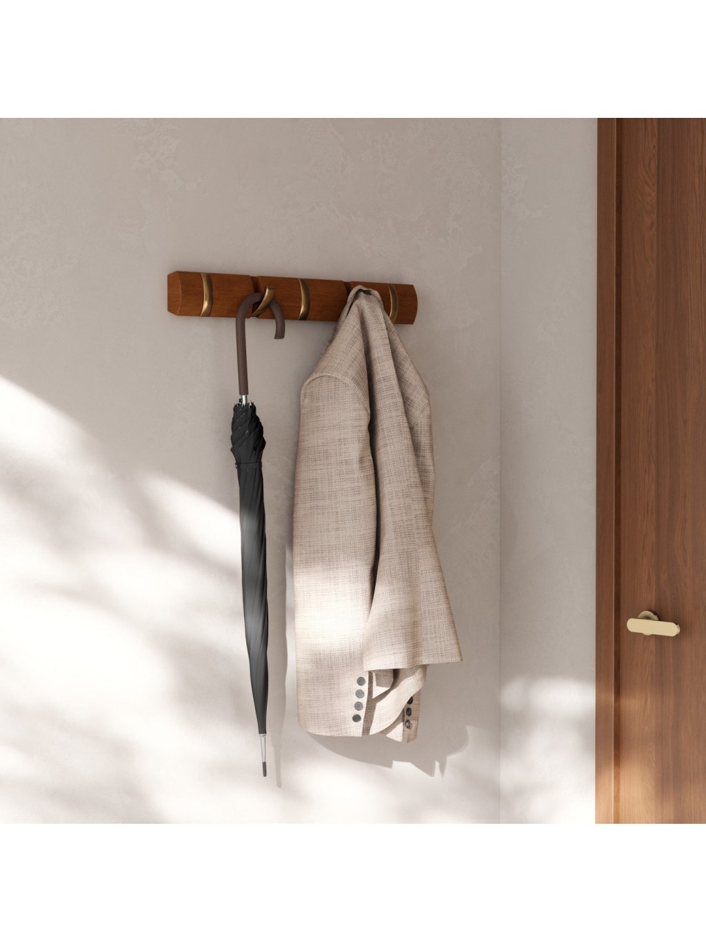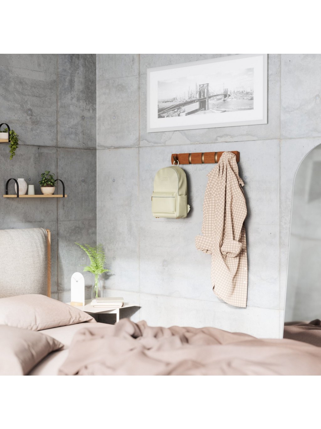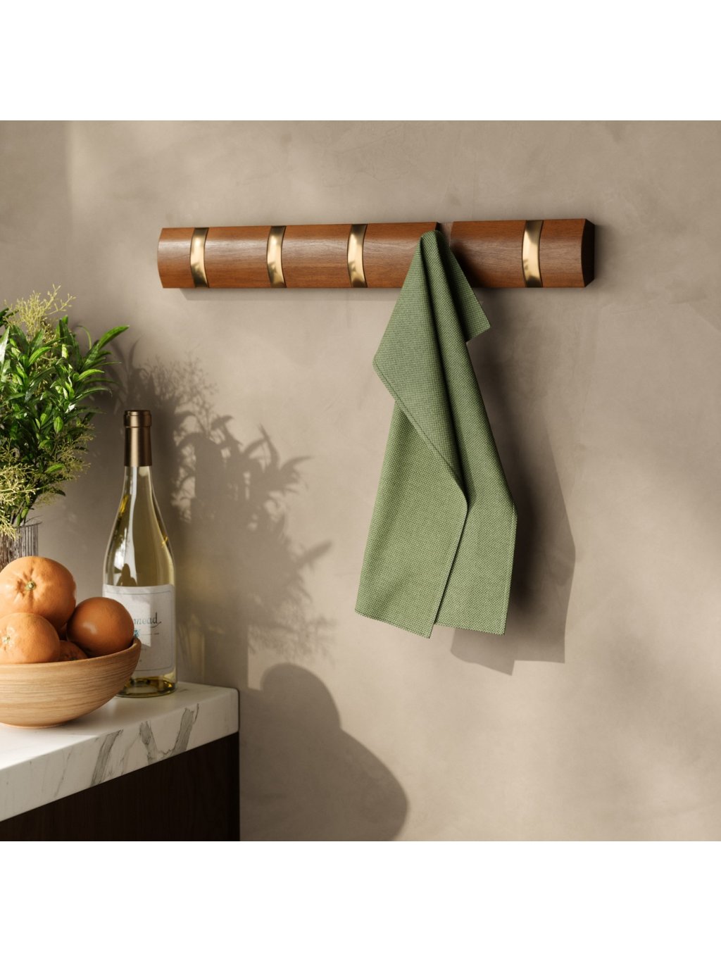 Umbra Flip Hook 5 je moderný nástenný vešiak so šikovným systémom výklopných háčikov, ktoré sa po použití elegantne zasunú späť do lišty. Vďaka tomu pôsobí minimalisticky a šetrí priestor – ideálna voľba do predsiene, spálne, kúpeľne alebo kancelárie. Každý háčik unesie až 2,3 kg (5 lbs) a poskytne dosť miesta pre kabáty, tašky, šály aj doplnky. Flip sa vďaka svojmu nadčasovému vzhľadu a skrytému uchyteniu na stenu stane praktickým aj dekoratívnym doplnkom vášho interiéru. Vyrobený z kvalitného dreva s prirodzenou kresbou, ktorá dodáva každému kusu osobitý charakter.