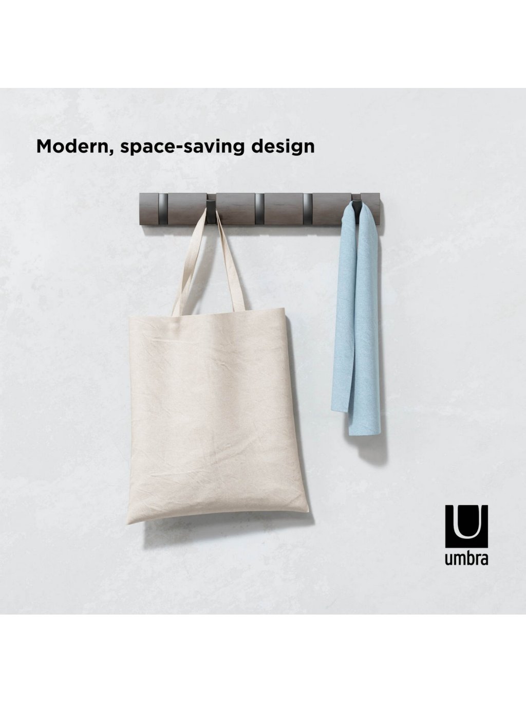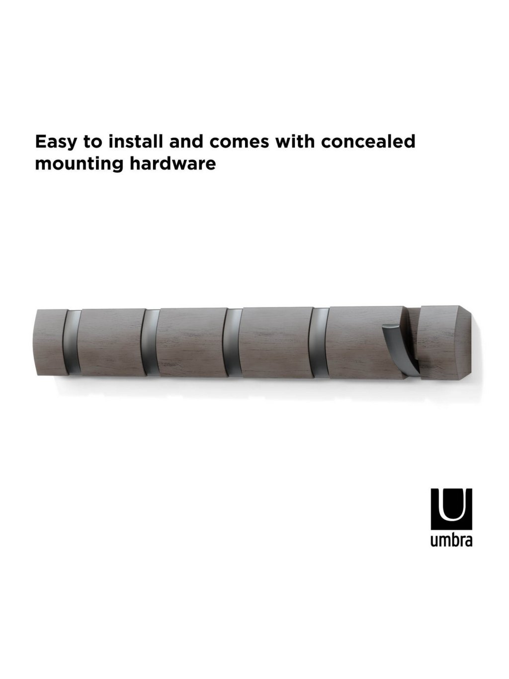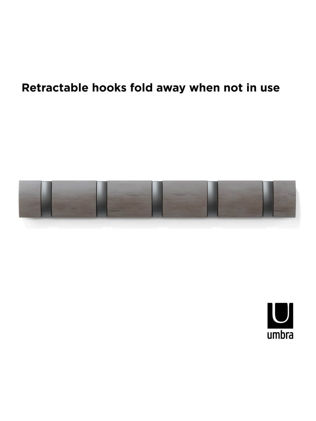 Umbra Flip Hook 5 je moderný nástenný vešiak so šikovným systémom výklopných háčikov, ktoré sa po použití elegantne zasunú späť do lišty. Vďaka tomu pôsobí minimalisticky a šetrí priestor – ideálna voľba do predsiene, spálne, kúpeľne alebo kancelárie. Každý háčik unesie až 2,3 kg (5 lbs) a poskytne dosť miesta pre kabáty, tašky, šály aj doplnky. Flip sa vďaka svojmu nadčasovému vzhľadu a skrytému uchyteniu na stenu stane praktickým aj dekoratívnym doplnkom vášho interiéru. Vyrobený z kvalitného dreva s prirodzenou kresbou, ktorá dodáva každému kusu osobitý charakter.