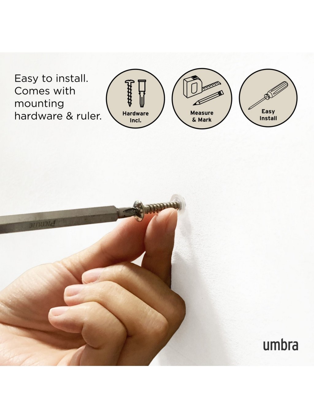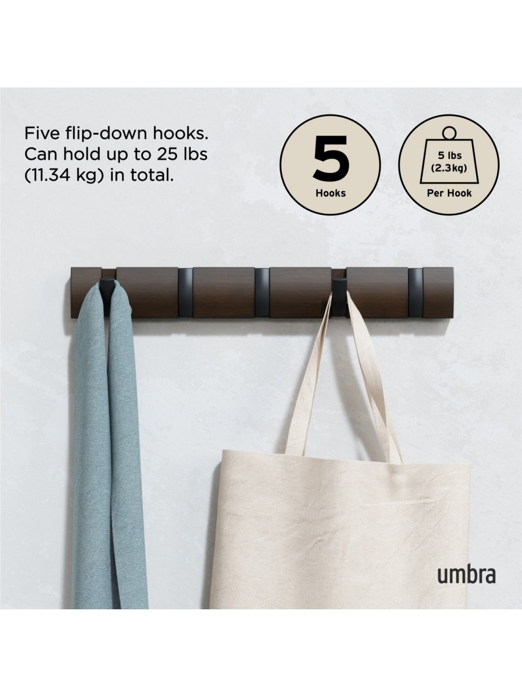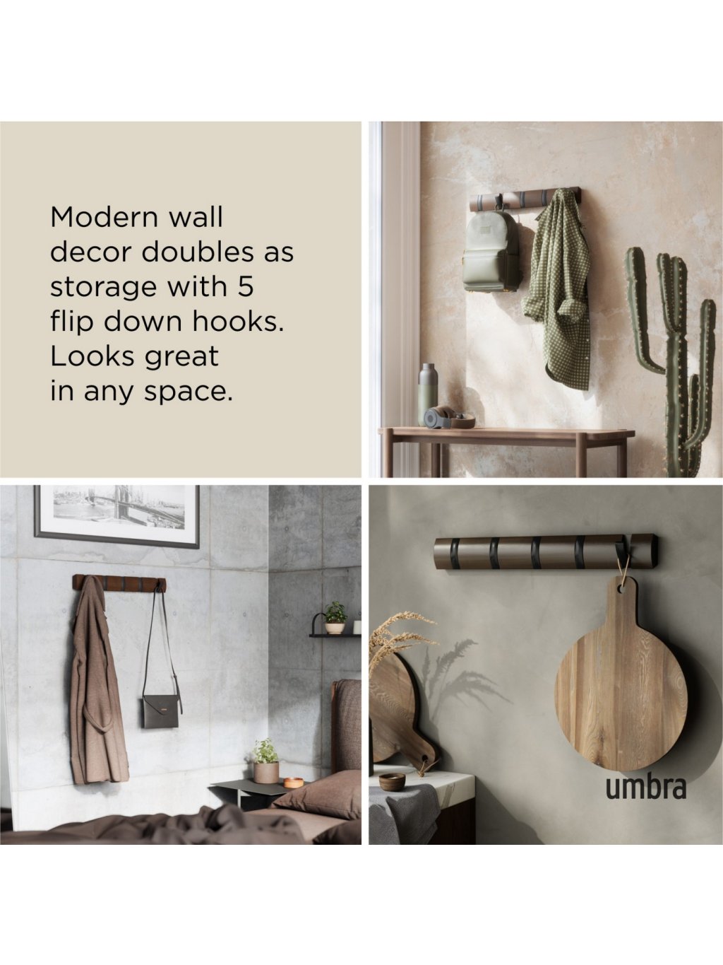 Umbra Flip Hook 5 je moderný nástenný vešiak so šikovným systémom výklopných háčikov, ktoré sa po použití elegantne zasunú späť do lišty. Vďaka tomu pôsobí minimalisticky a šetrí priestor – ideálna voľba do predsiene, spálne, kúpeľne alebo kancelárie. Každý háčik unesie až 2,3 kg (5 lbs) a poskytne dosť miesta pre kabáty, tašky, šály aj doplnky. Flip sa vďaka svojmu nadčasovému vzhľadu a skrytému uchyteniu na stenu stane praktickým aj dekoratívnym doplnkom vášho interiéru. Vyrobený z kvalitného dreva s prirodzenou kresbou, ktorá dodáva každému kusu osobitý charakter.