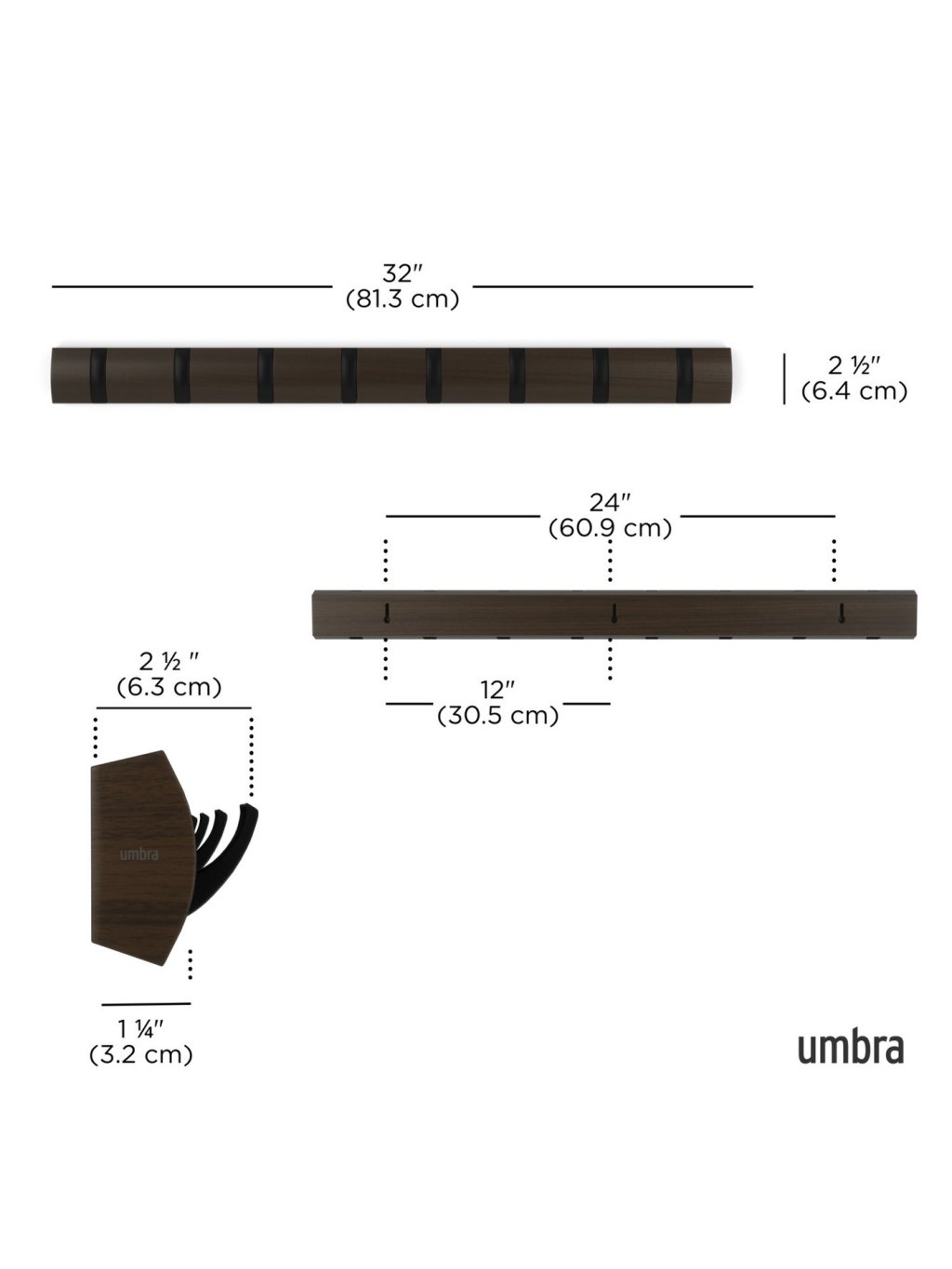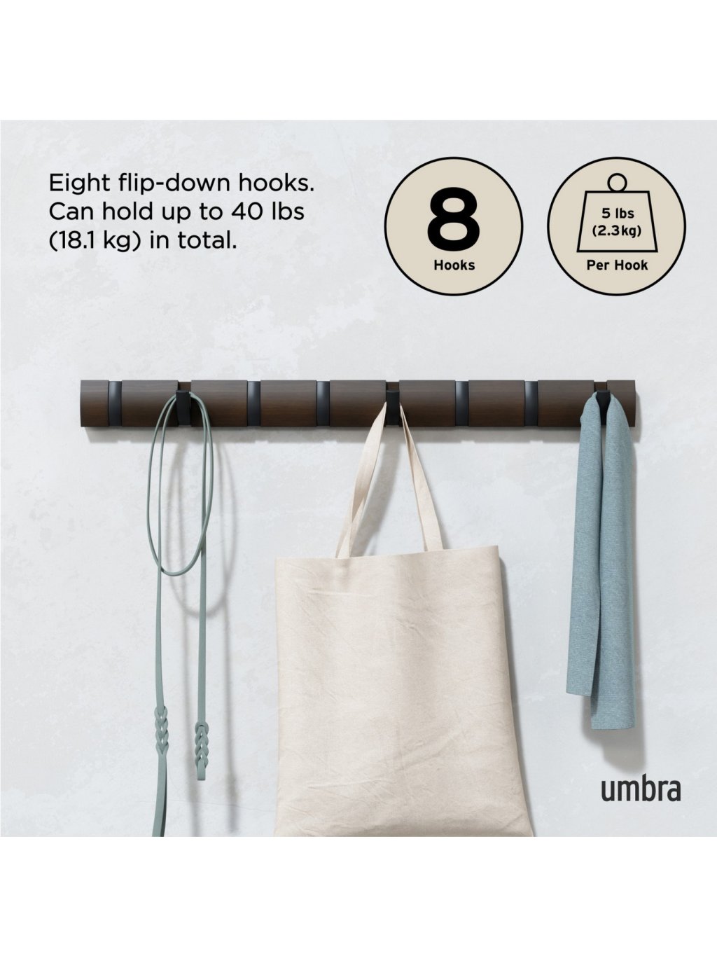 Umbra Flip Hook 8 je moderný nástenný vešiak so šikovným systémom výklopných háčikov, ktoré sa po použití zasunú späť do lišty a vytvoria tak čistý, elegantný vzhľad. Vďaka svojmu predĺženému tvaru poskytuje dostatok priestoru až na osem kusov oblečenia či doplnkov – ideálny pre väčšie rodiny alebo frekventované vstupné priestory. Flip je vyrobený z kvalitného dreva s prirodzenou kresbou a skrytým systémom uchytenia , vďaka čomu pôsobí minimalisticky a harmonicky v každom interiéri. Perfektná voľba pre kabáty, šály, kabelky aj uteráky.
