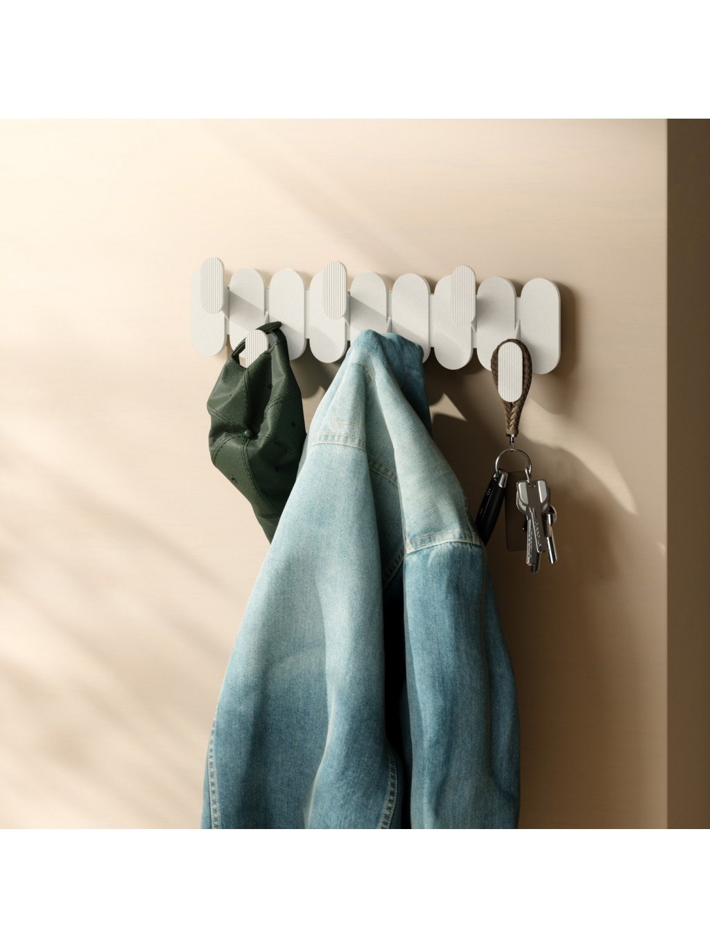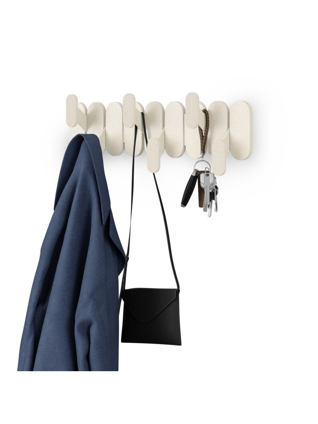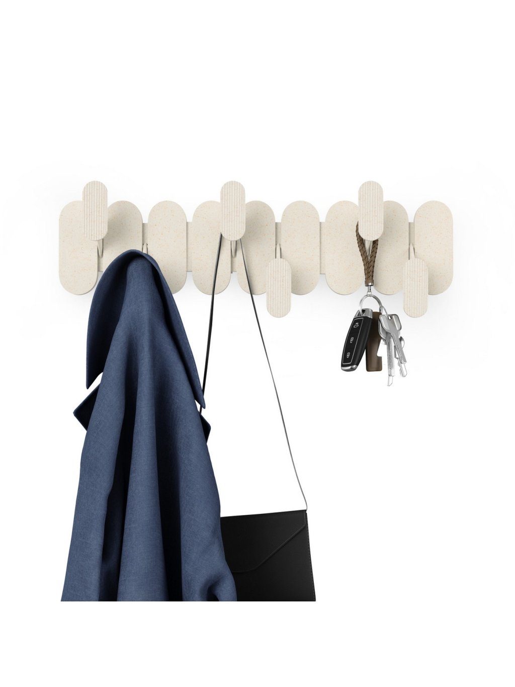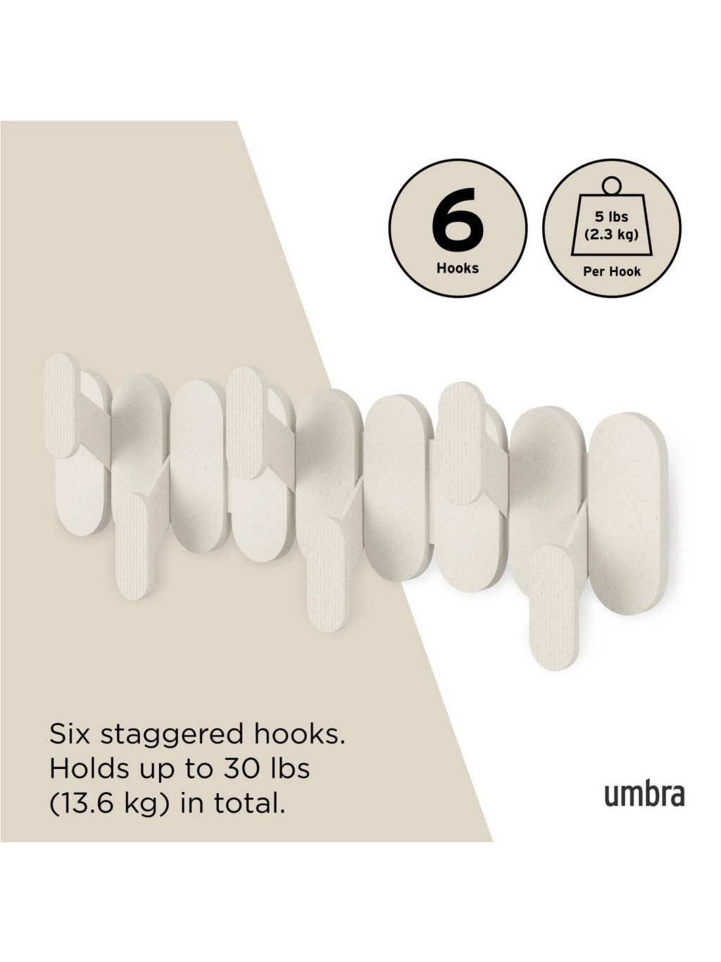 Umbra Tempo 6 Hook kombinuje moderný štýl a praktickú funkčnosť v elegantnom nástennom prevedení. Šesť striedavo umiestnených háčikov vytvára výrazný grafický prvok, ktorý dodá vášmu priestoru osobitý vzhľad a zároveň poskytne dostatok miesta na zavesenie kabátov, tašiek, uterákov alebo doplnkov. Vyrobený z ľahkého a odolného recyklovaného plastu zmiešaného s drevenými vláknami , čo mu dodáva jemnú prírodnú textúru. Ľahko sa inštaluje a vďaka možnosti kombinovať viac kusov môžete vytvoriť praktickú aj dekoratívnu stenu na zavesenie všetkého potrebného.