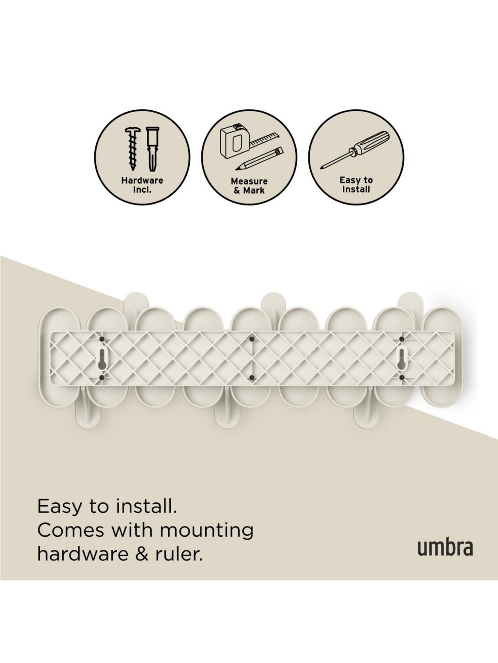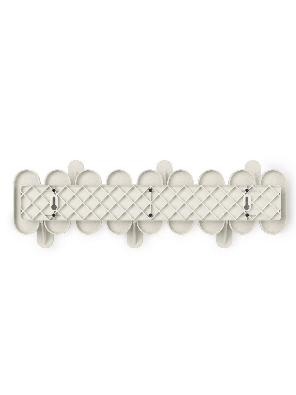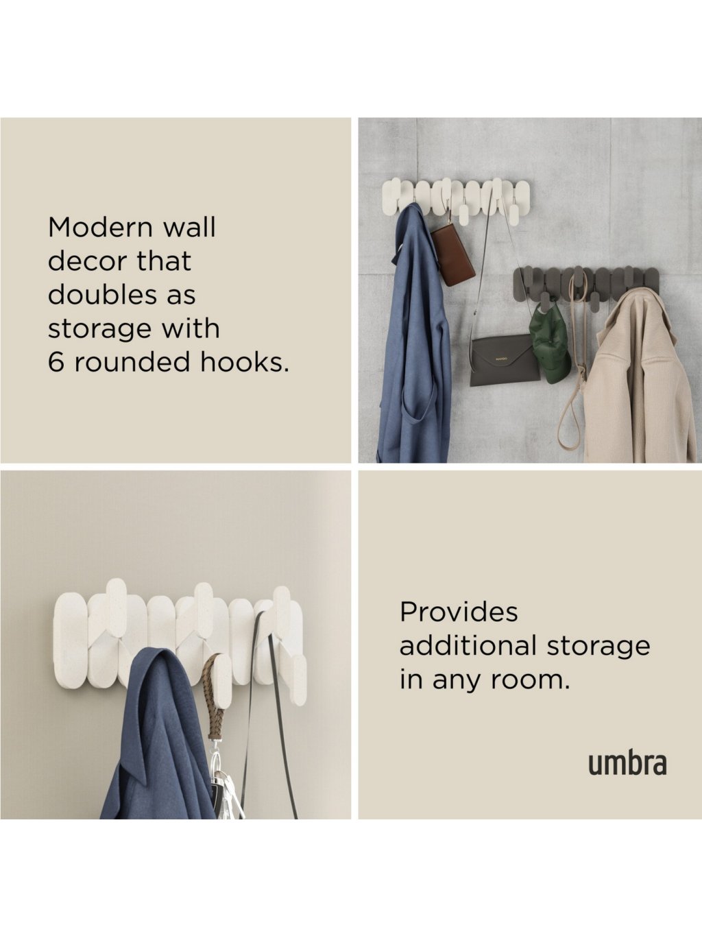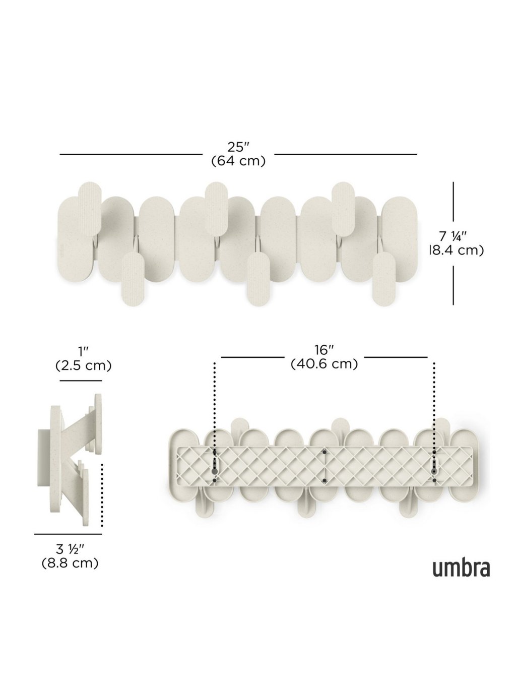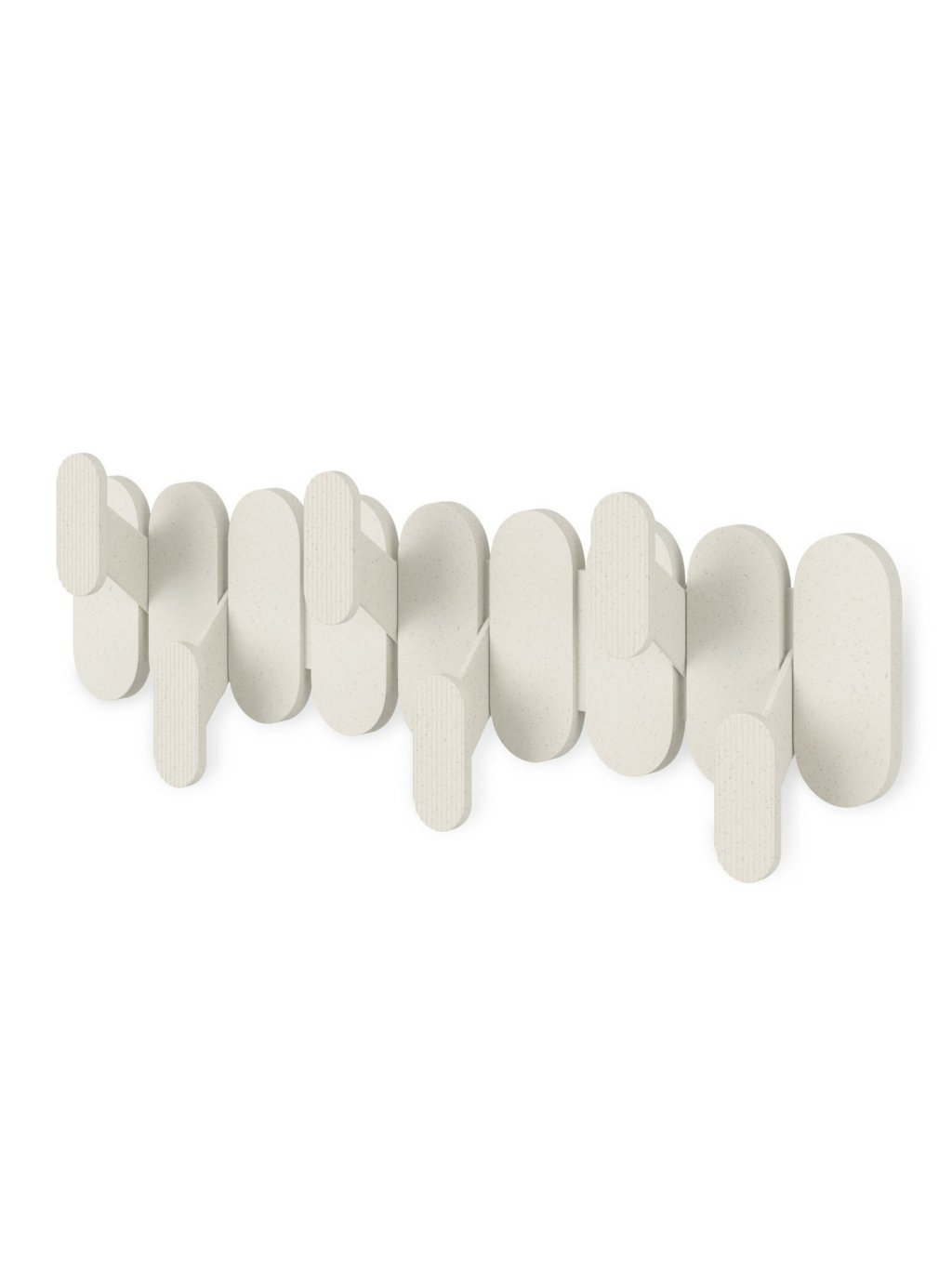 Umbra Tempo 6 Hook kombinuje moderný štýl a praktickú funkčnosť v elegantnom nástennom prevedení. Šesť striedavo umiestnených háčikov vytvára výrazný grafický prvok, ktorý dodá vášmu priestoru osobitý vzhľad a zároveň poskytne dostatok miesta na zavesenie kabátov, tašiek, uterákov alebo doplnkov. Vyrobený z ľahkého a odolného recyklovaného plastu zmiešaného s drevenými vláknami , čo mu dodáva jemnú prírodnú textúru. Ľahko sa inštaluje a vďaka možnosti kombinovať viac kusov môžete vytvoriť praktickú aj dekoratívnu stenu na zavesenie všetkého potrebného.