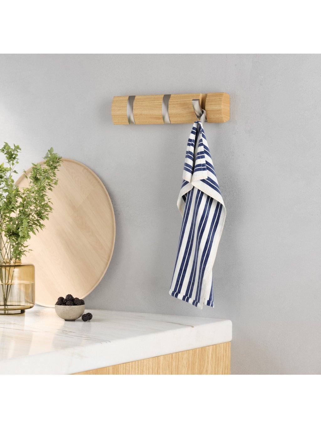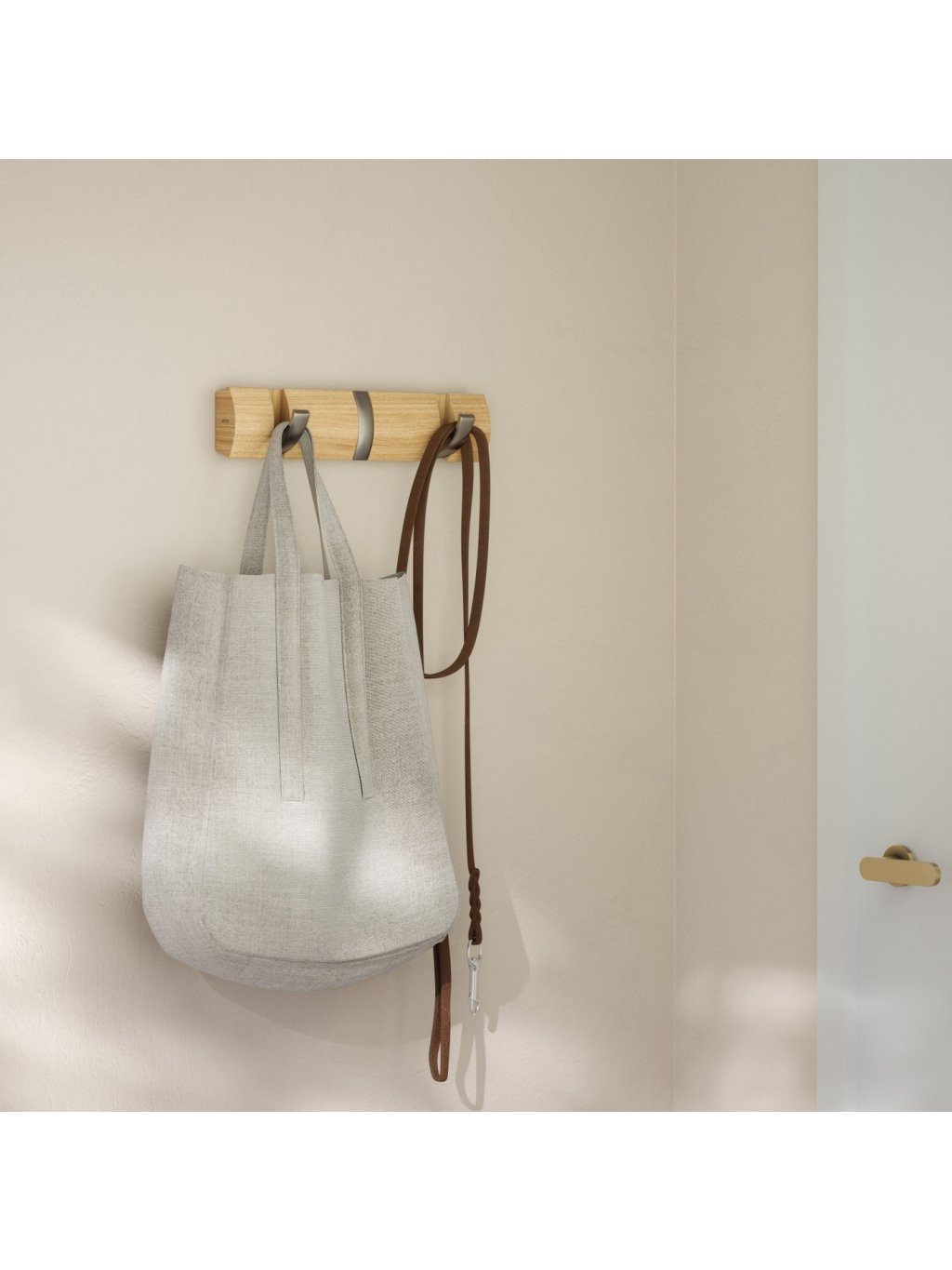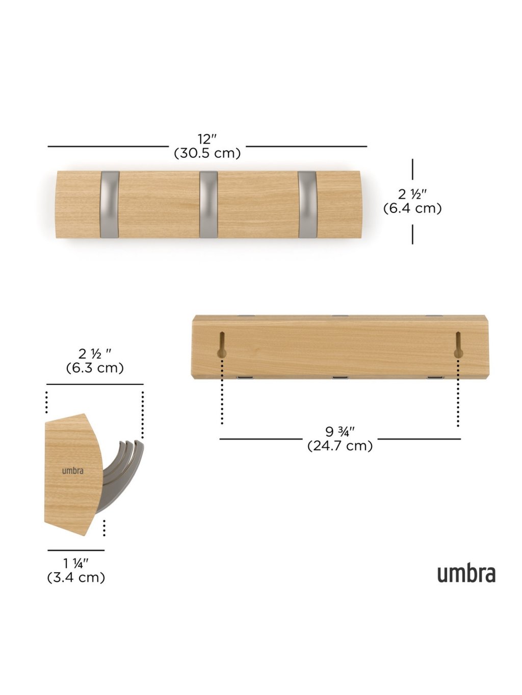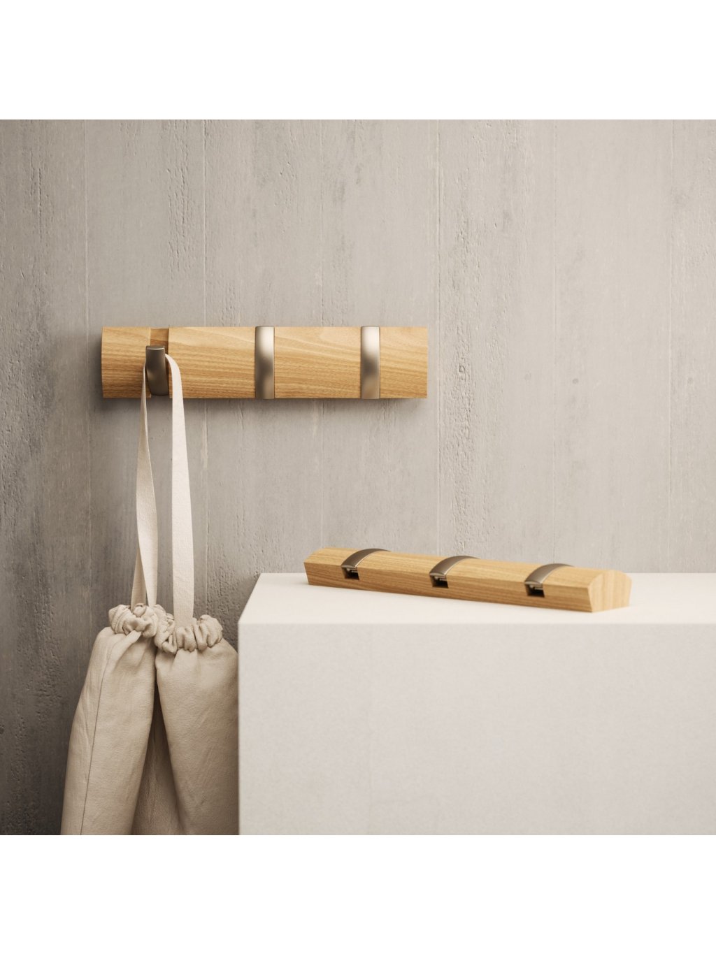 Umbra Flip Hook 3 je moderný nástenný vešiak so šikovným systémom výklopných háčikov, ktoré sa po použití ľahko zasunú späť a vytvoria tak čistý, minimalistický vzhľad. Vďaka svojej kompaktnej veľkosti je ideálny do menších priestorov, kde každý centimeter hrá úlohu – predsiení, kúpeľní, spální alebo kancelárií. Každý háčik unesie až 2,3 kg (5 lbs) a poskytne praktické miesto pre kabáty, tašky, uteráky aj doplnky. Skryté uchytenie zaisťuje elegantný vzhľad bez viditeľných skrutiek. Vyrobené z dreva z obnoviteľných zdrojov s prirodzenou kresbou, ktorá dáva každému kusu originálny charakter.
