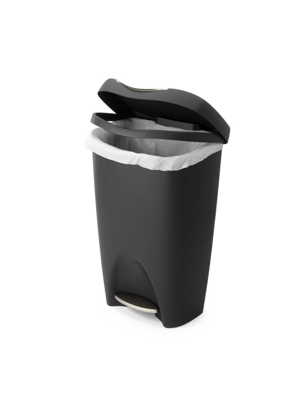 Umbra Brim Trash Can prináša moderný dizajn, funkčnosť a kvalitu v jednom. Vďaka elegantným kontúram a saténovému povrchu sa stane štýlovým doplnkom vašej kuchyne či kancelárie. Robustný pedál z nerezovej ocele aktivuje inovatívny systém tichého dovierania veka , zatiaľ čo vnútorný krúžok bezpečne drží vrece na mieste a zároveň ho skryje. Široký otvor zaisťuje ľahké vynášanie odpadu a vďaka konštrukcii z polypropylénu je kôš odolný, ľahký a ľahko umývateľný . Objem 50 l poskytuje dostatok priestoru na každodenné použitie – ideálny pre domácnosti aj komerčné priestory.