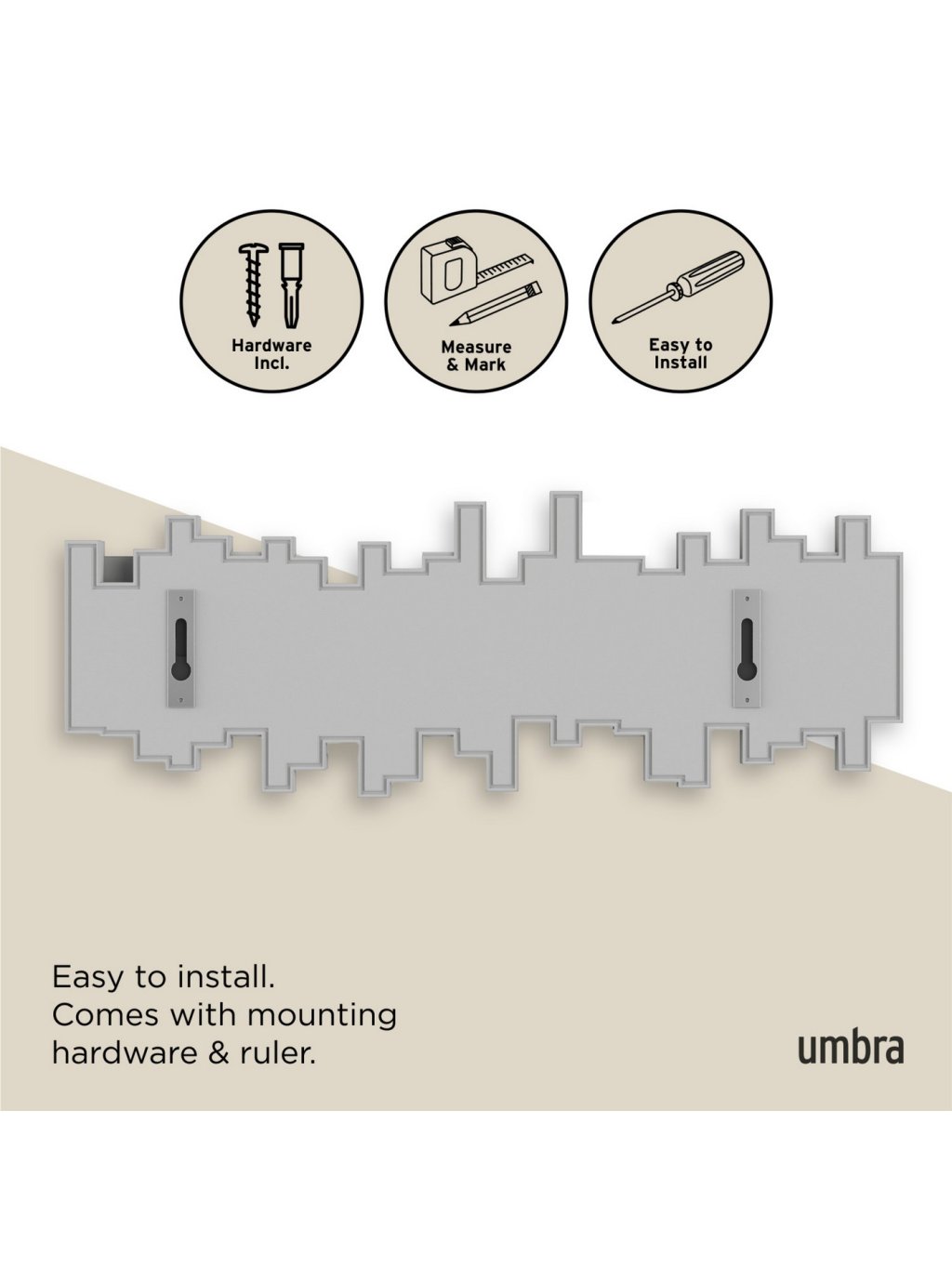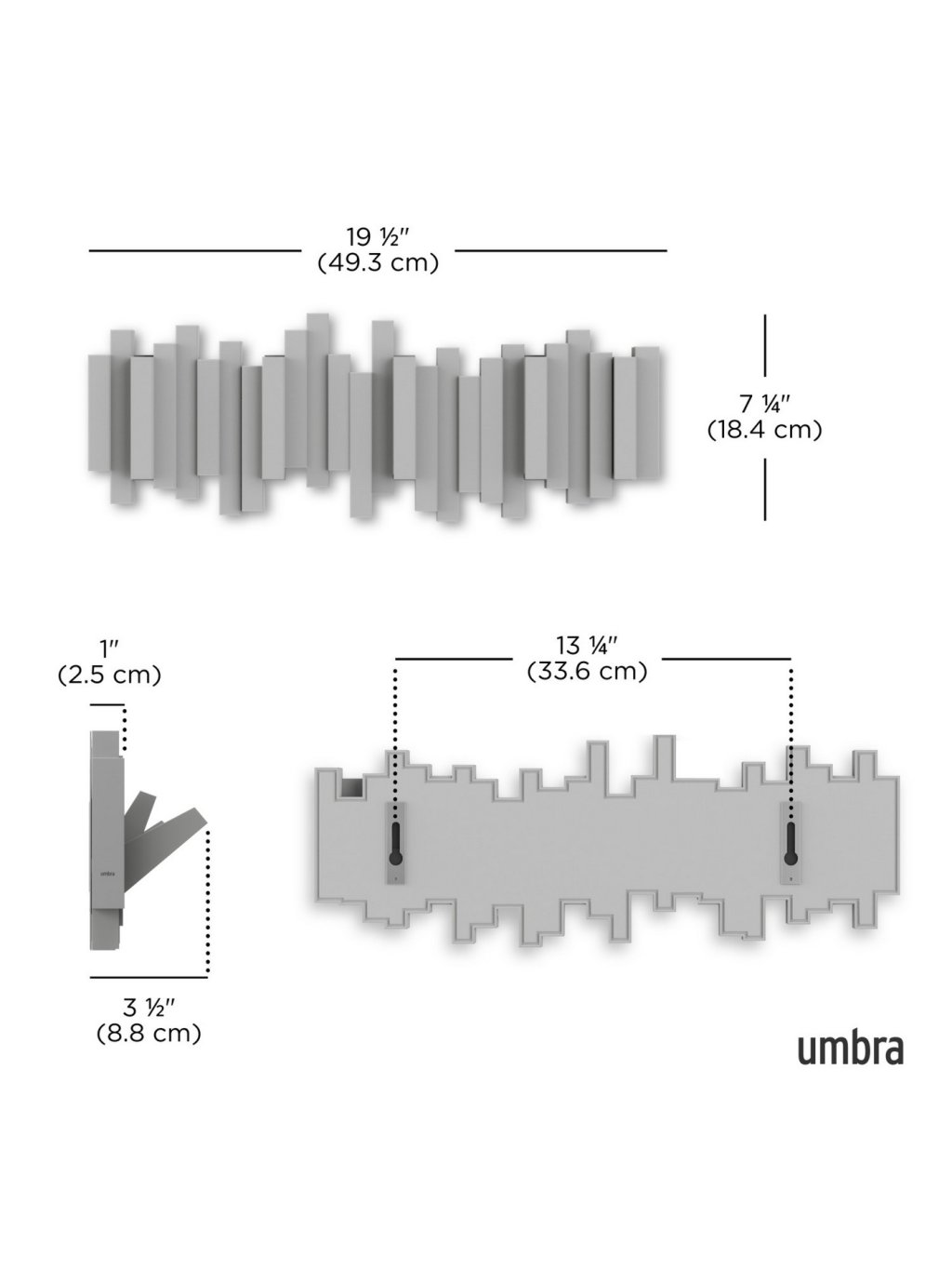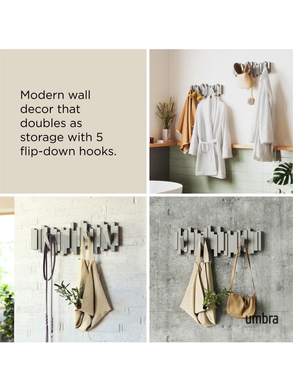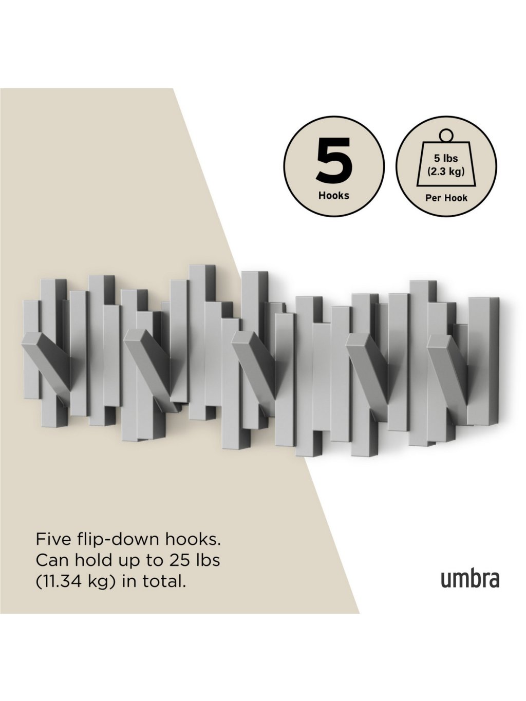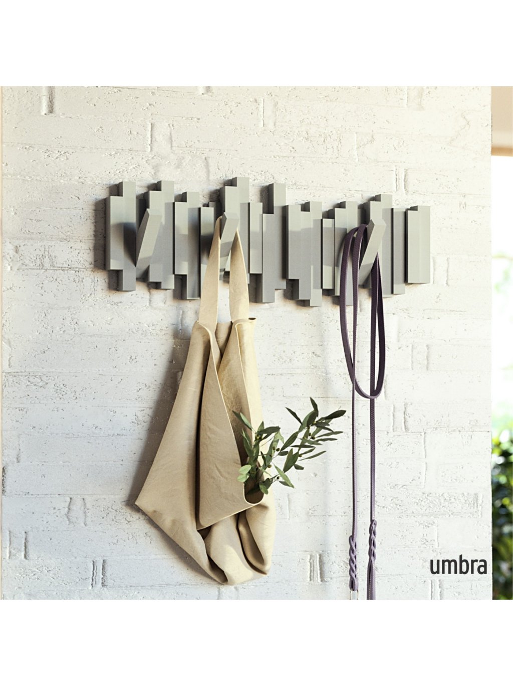 Umbra Sticks Multi Hook je moderný nástenný vešiak , ktorý na prvý pohľad pôsobí ako dizajnová plastika, ale skrýva praktickú funkciu. Päť výklopných háčikov s nosnosťou až 2,3 kg (5 lbs) každý poskytuje dostatok priestoru pre kabáty, šály, tašky alebo doplnky. Keď háčiky nepoužívaš, jednoducho sa zaklapnú späť a vytvoria čistý a minimalistický vzhľad . Vyrobený z recyklovaných plastov a ľahko sa inštaluje - ideálny do predsiene, spálne či kancelárie. Štýlový detail, ktorý poteší oko aj uľahčí život.
