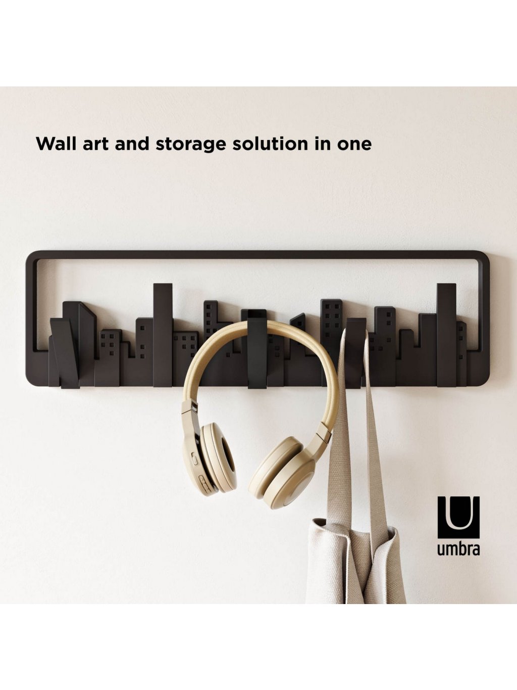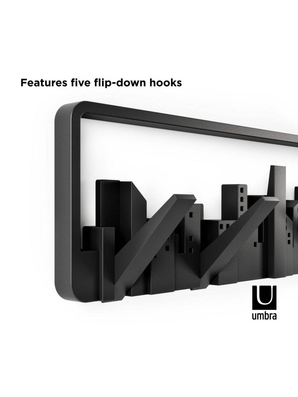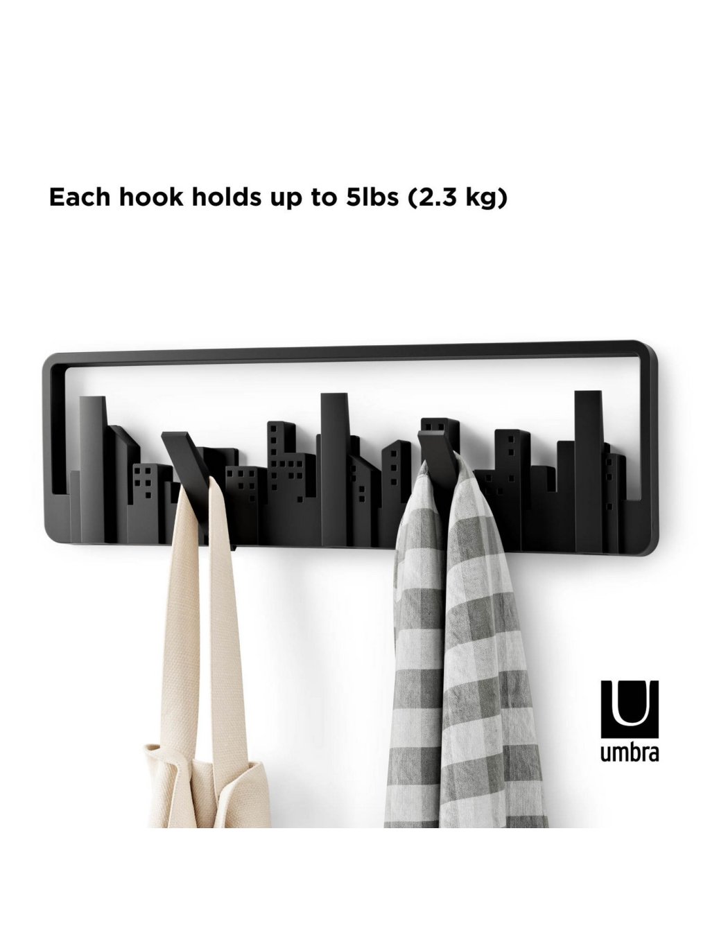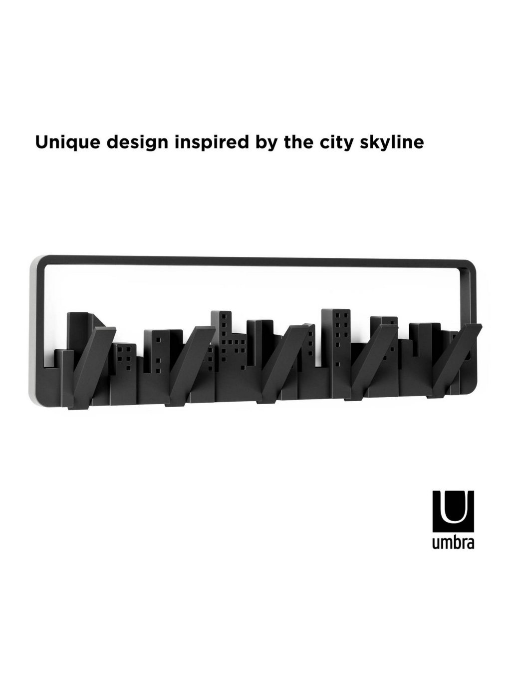 Umbra Skyline Multi Hook je praktický aj dekoratívny nástenný vešiak inšpirovaný mestskou architektúrou. Na prvý pohľad pôsobí ako umelecký obraz so siluetou mesta, ale po sklopení sa premení na päť pevných háčikov pre kabáty, tašky, šály či doplnky. Každý háčik unesie až 2,3 kg (5 lbs) , čo z neho robí ideálne riešenie pre predsiene, kancelárie, spálne či detské izby. Vyrobený z recyklovaných plastov s dôrazom na dlhú životnosť a šetrnosť k prírode.