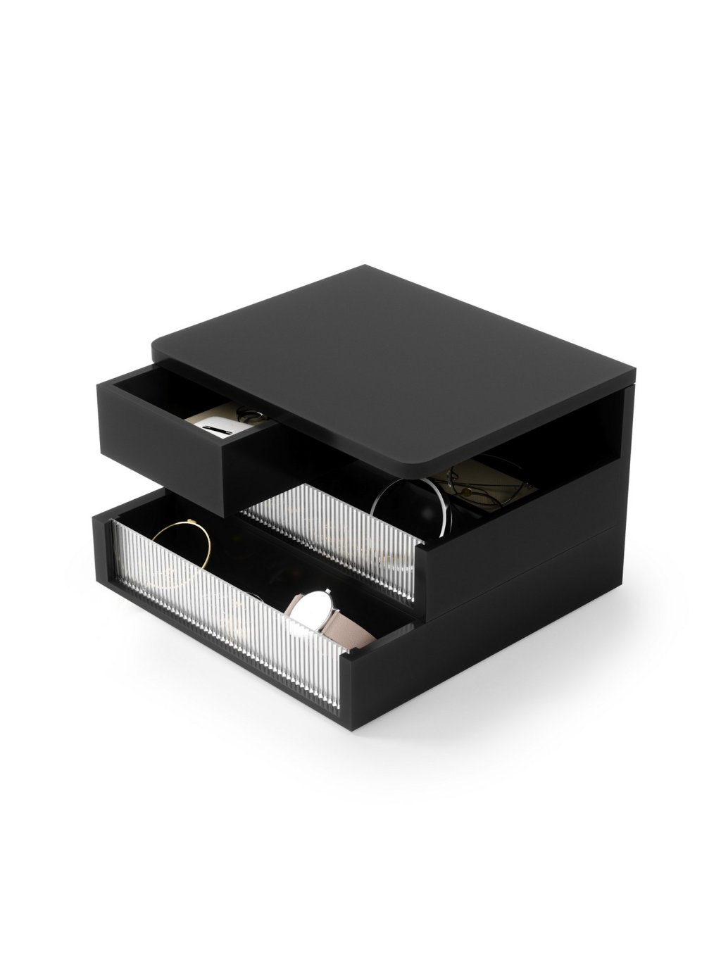 - 3 poschodia s priestrannými priehradkami pre prehľadnú organizáciu šperkov
