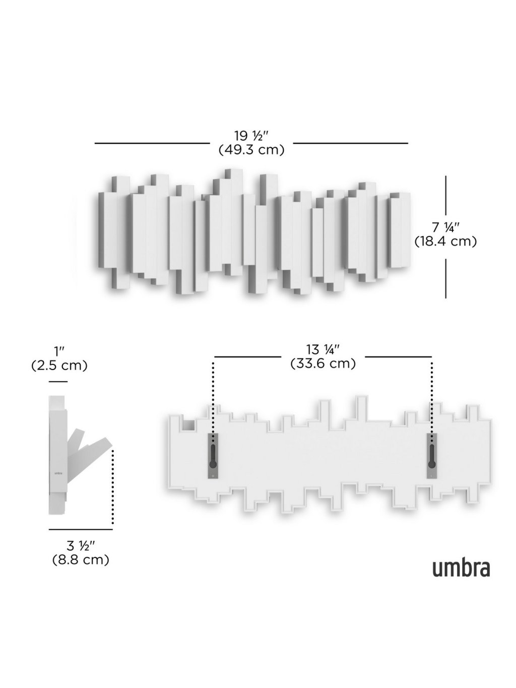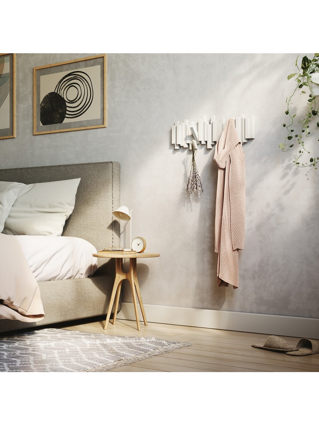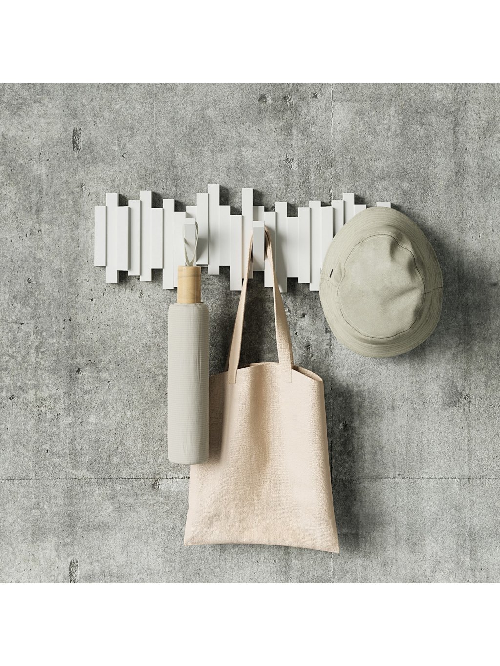 Umbra Sticks Multi Hook je moderný nástenný vešiak , ktorý na prvý pohľad pôsobí ako dizajnová plastika, ale skrýva praktickú funkciu. Päť výklopných háčikov s nosnosťou až 2,3 kg (5 lbs) každý poskytuje dostatok priestoru pre kabáty, šály, tašky alebo doplnky. Keď háčiky nepoužívaš, jednoducho sa zaklapnú späť a vytvoria čistý a minimalistický vzhľad . Vyrobený z recyklovaných plastov a ľahko sa inštaluje - ideálny do predsiene, spálne či kancelárie. Štýlový detail, ktorý poteší oko aj uľahčí život.