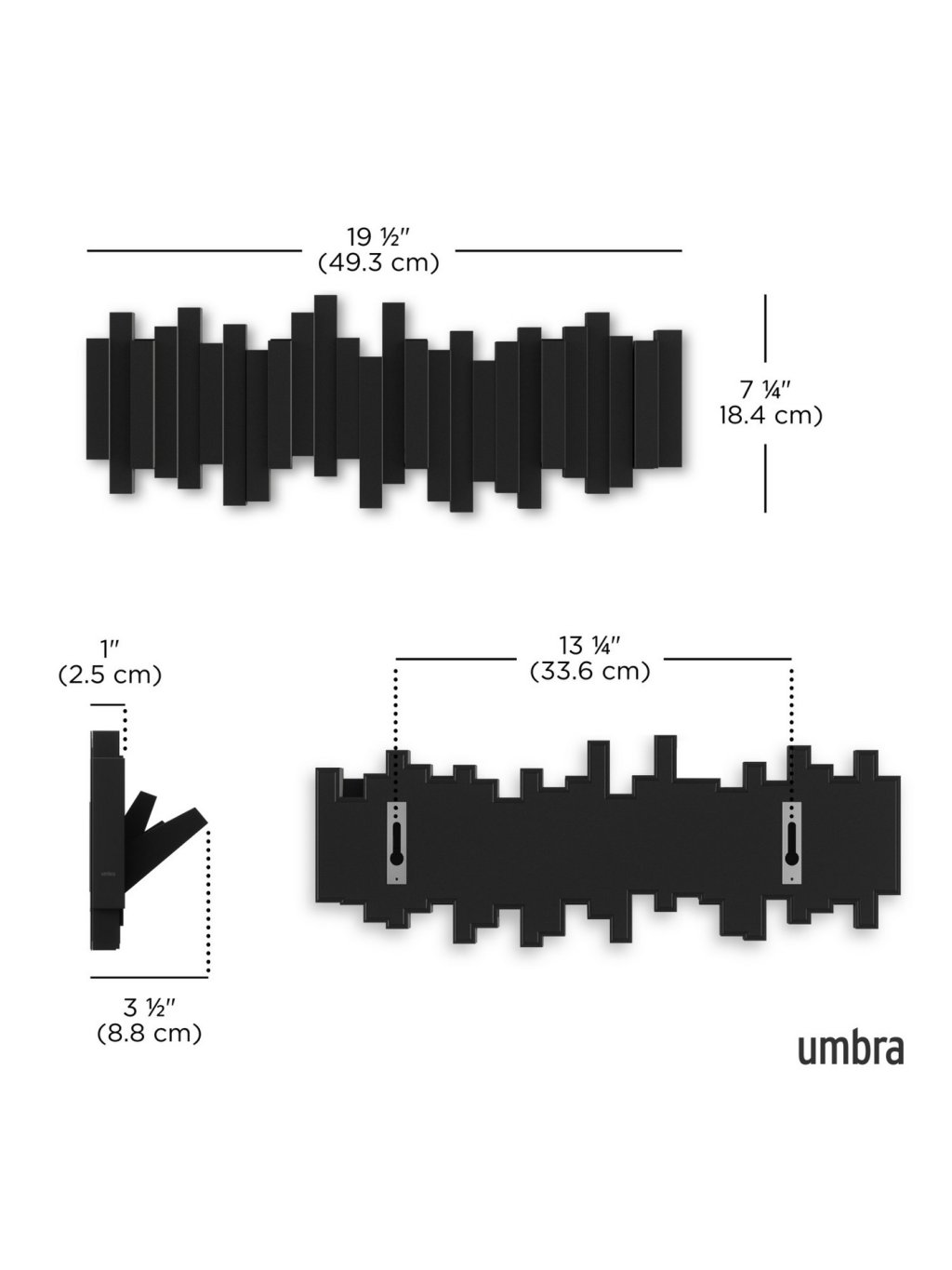 Umbra Sticks Multi Hook je moderný nástenný vešiak , ktorý na prvý pohľad pôsobí ako dizajnová plastika, ale skrýva praktickú funkciu. Päť výklopných háčikov s nosnosťou až 2,3 kg (5 lbs) každý poskytuje dostatok priestoru pre kabáty, šály, tašky alebo doplnky. Keď háčiky nepoužívaš, jednoducho sa zaklapnú späť a vytvoria čistý a minimalistický vzhľad . Vyrobený z recyklovaných plastov a ľahko sa inštaluje - ideálny do predsiene, spálne či kancelárie. Štýlový detail, ktorý poteší oko aj uľahčí život.