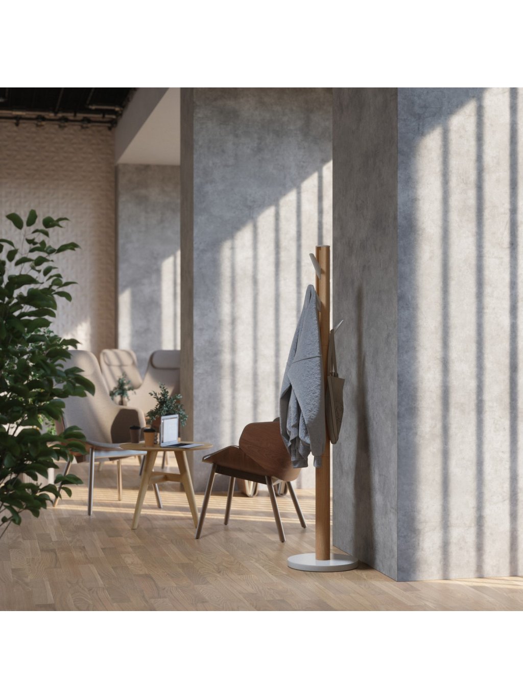Vďaka svojmu štíhlemu tvaru a výške 168 cm sa hodí aj do menších priestorov, kde poskytne dostatok miesta na kabáty, tašky či doplnky. Vyrobený z kaučukového dreva z obnoviteľných zdrojov a dostupný v niekoľkých moderných povrchových úpravách, ktoré ladia s rôznymi štýlmi interiéru.
