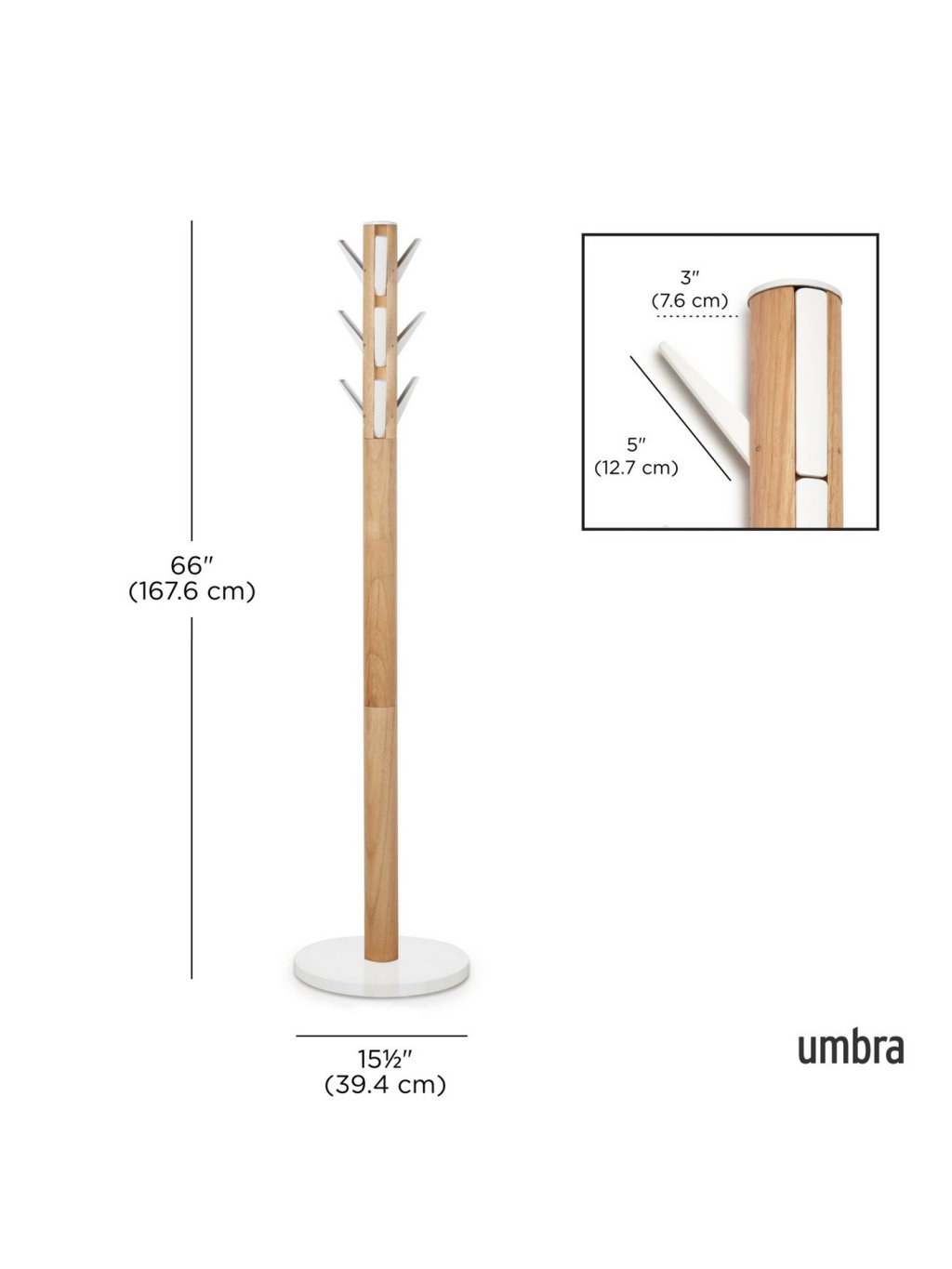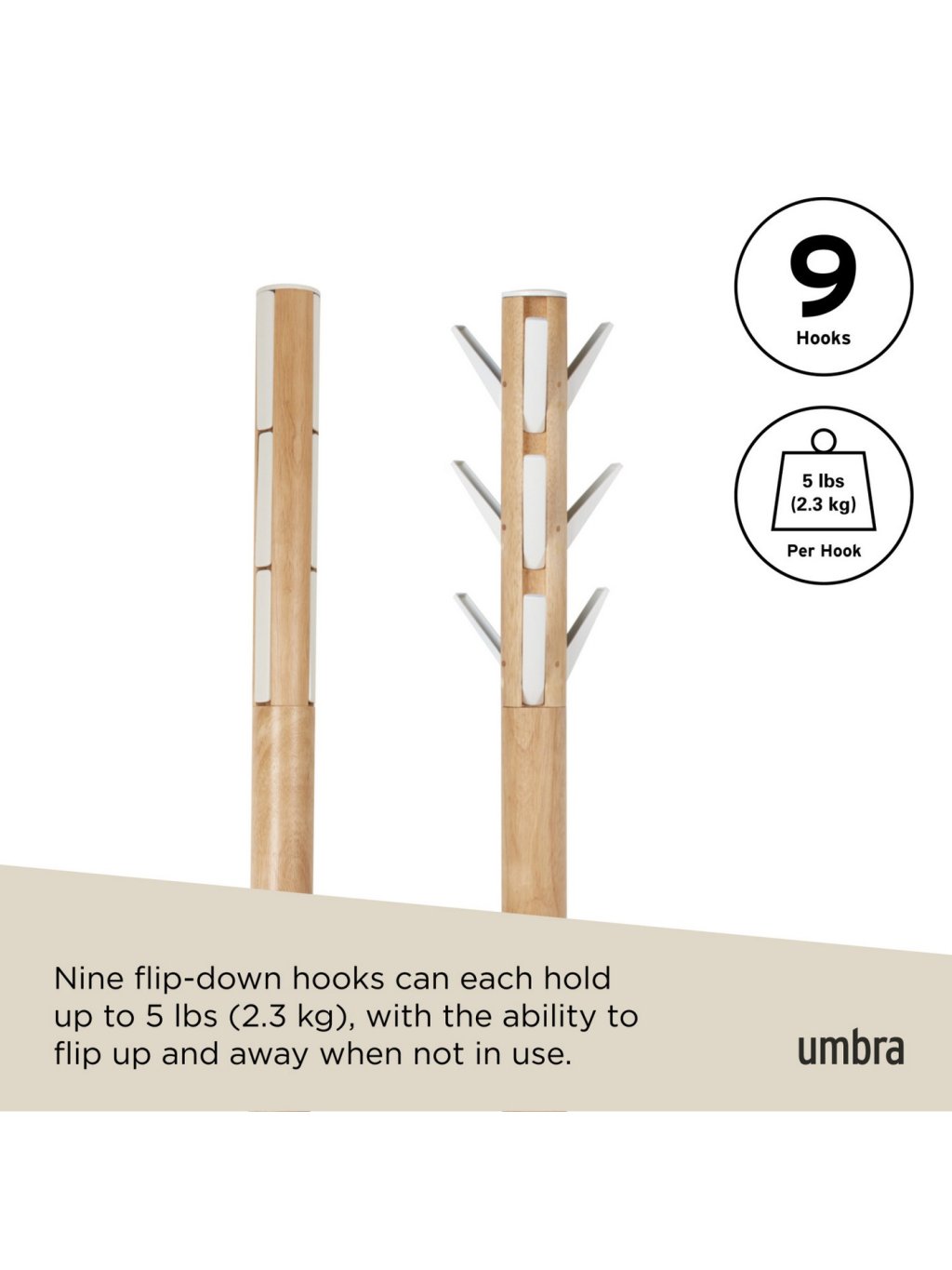 Umbra Flapper Coat Rack je moderný drevený stojanový vešiak, ktorý spája prírodný vzhľad a funkčný design. Ponúka deväť výklopných háčikov , ktoré je možné jednoducho zasunúť späť, keď nie sú potrebné – ideálne riešenie pre prehľadné a elegantné usporiadanie predsiene či spálne.