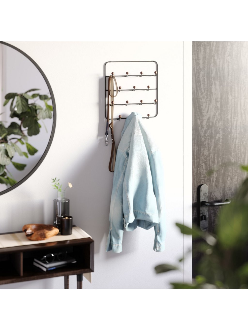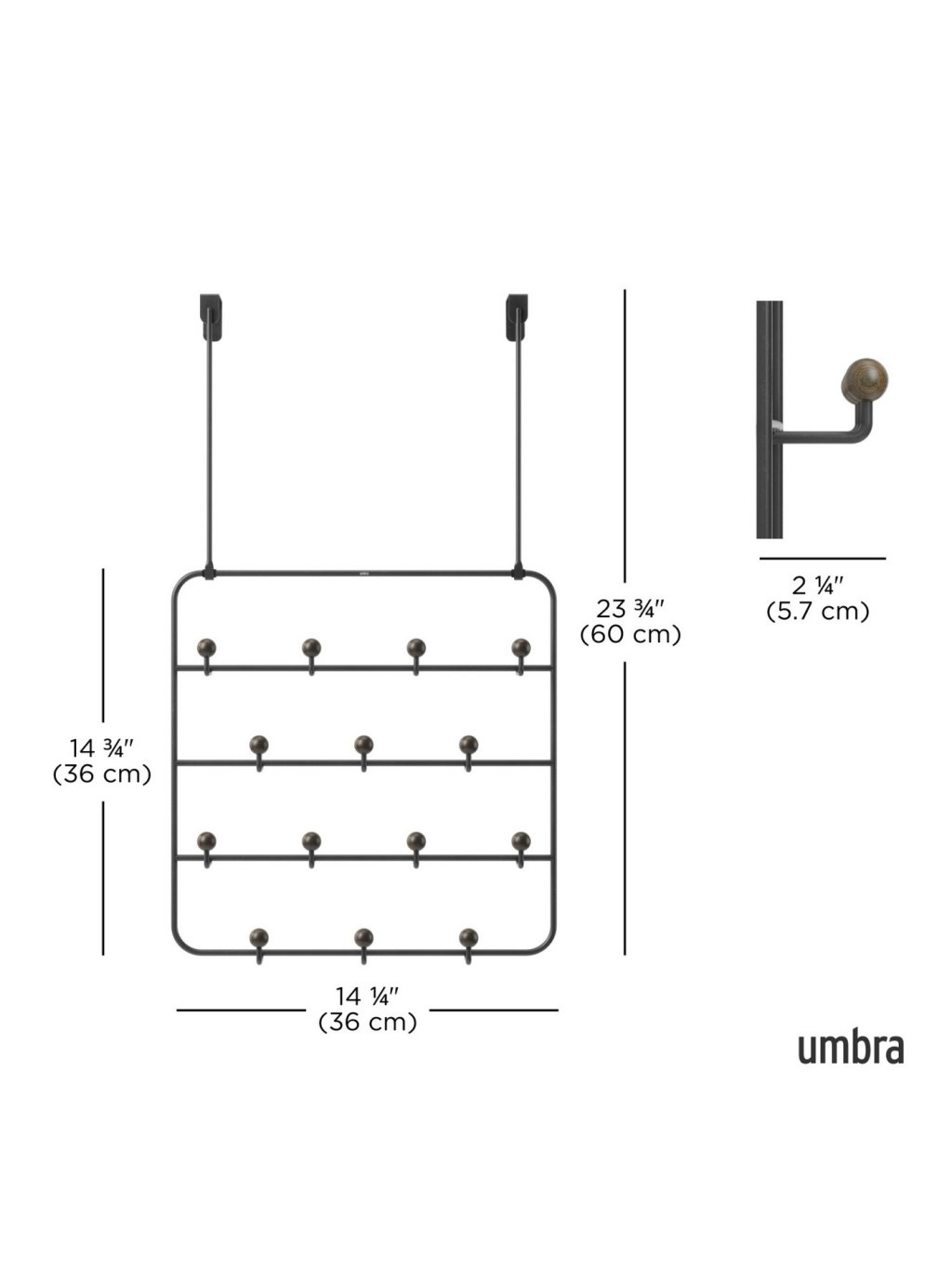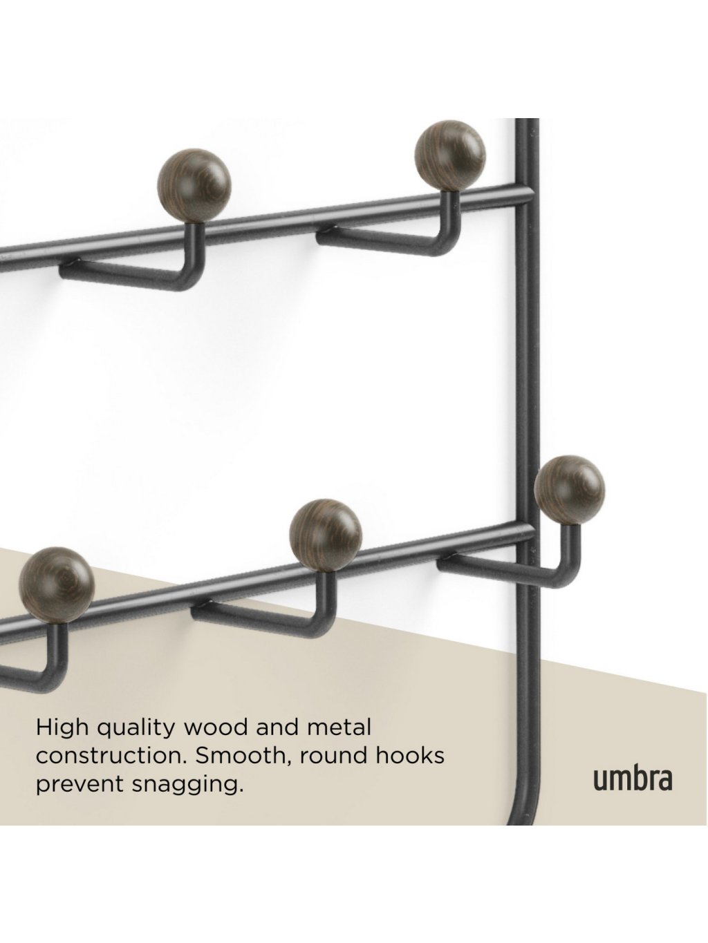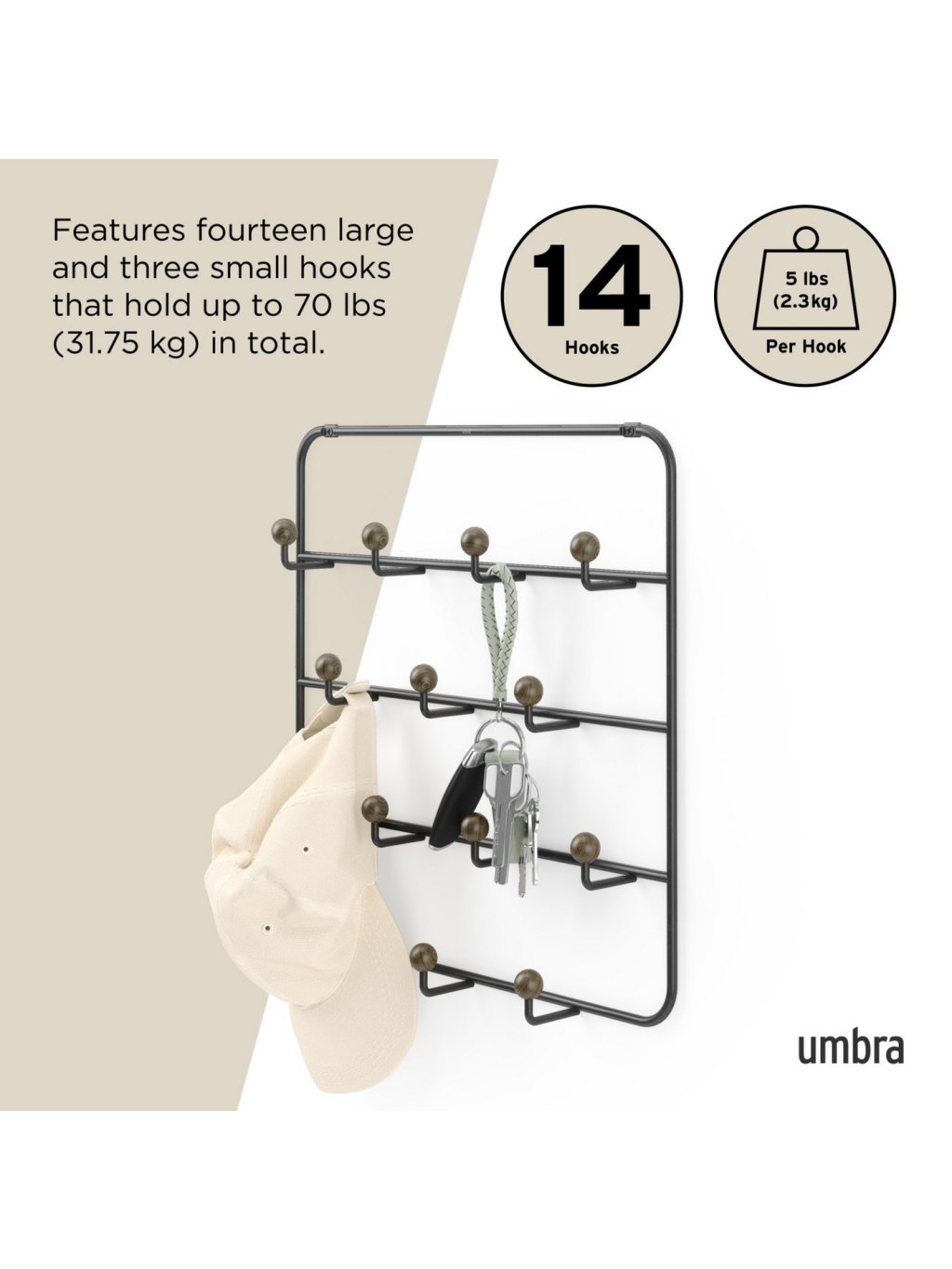 Umbra Estique je praktický organizér so 14 háčikmi, ktorý pomôže udržať poriadok a mať všetky nevyhnutnosti vždy po ruke. Drevené guličky na konci háčikov chránia jemné tkaniny pred zatrhnutím a zároveň dodávajú vešiaku teplý a moderný vzhľad. Vďaka univerzálnemu uchyteniu ho môžete ľahko zavesiť na dvere alebo pripevniť priamo na stenu.