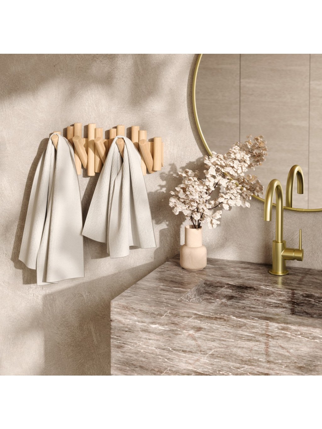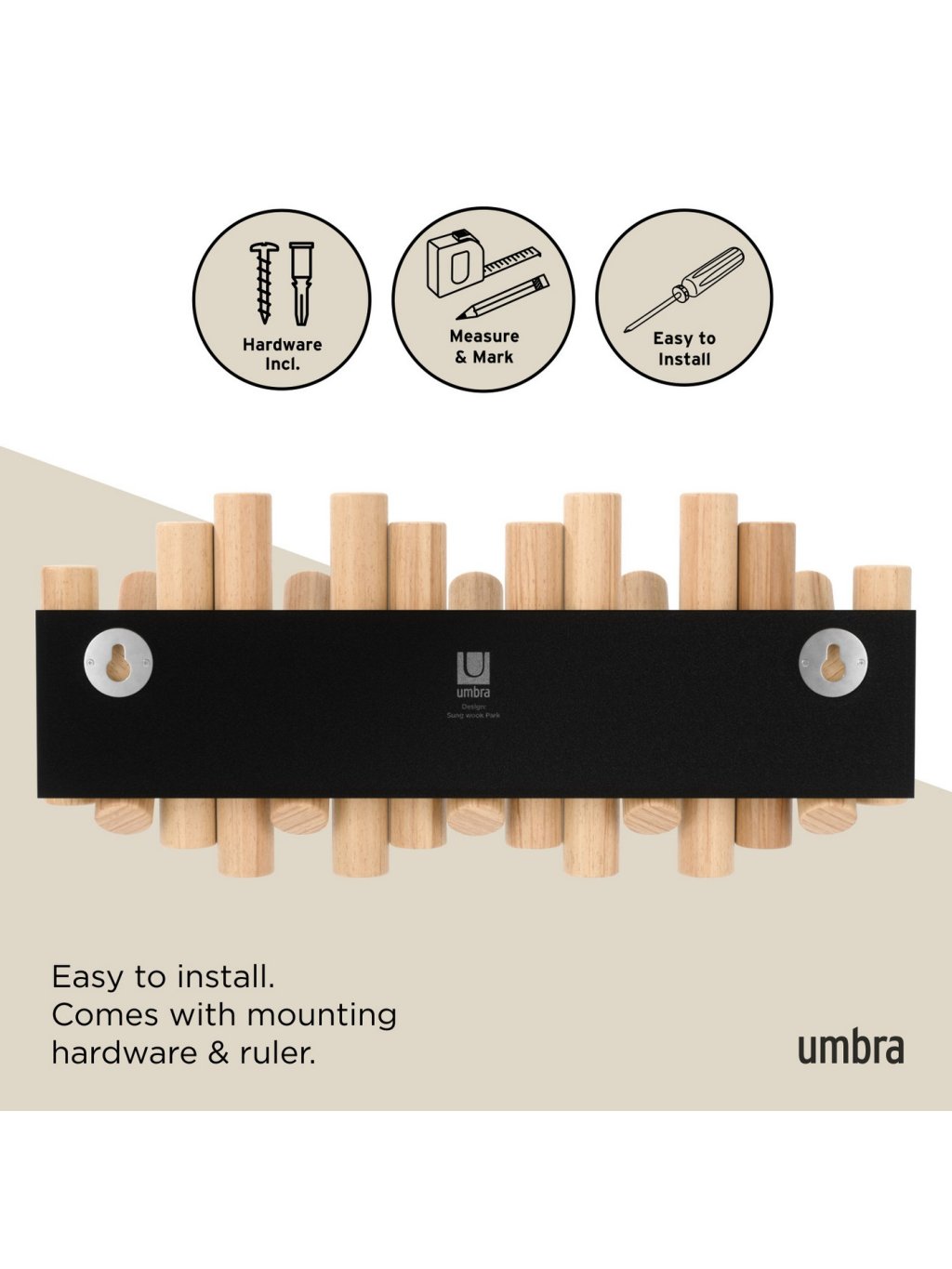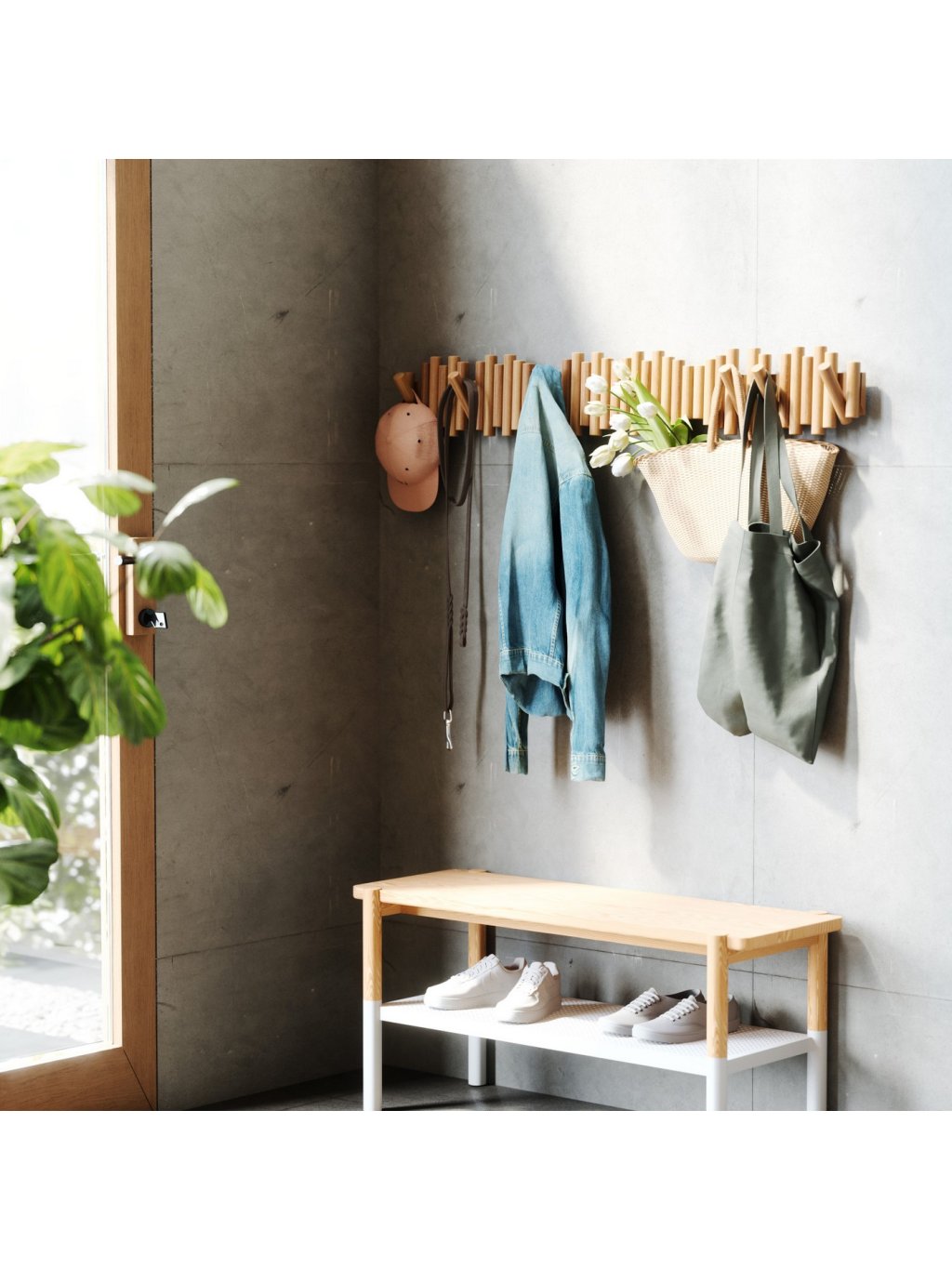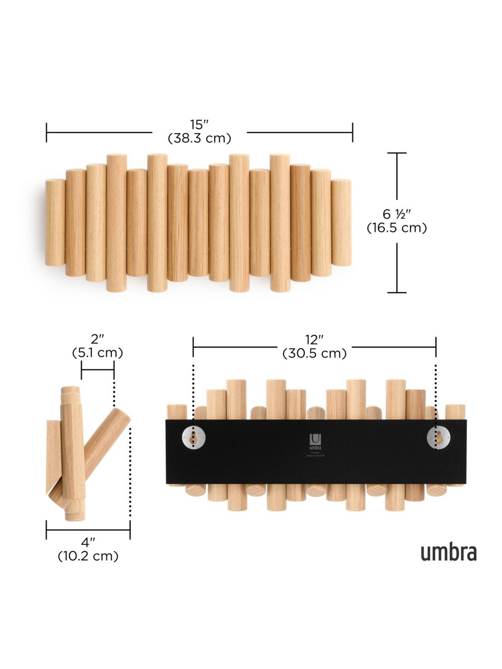 Umbra Picket je viac než len vešiak - je to dizajnový prvok, ktorý pridá vášmu interiéru hrejivosť a charakter. Je vyrobený z krásne opracovaného borovicového dreva a ponúka päť sklopných háčikov, z ktorých každý unesie až 2,3 kg. Keď háčiky nepoužívate, jednoducho ich sklopíte a Picket sa premení na elegantnú drevenú dekoráciu s čistým profilom. Perfektný do predsiene, spálne alebo aj kancelárie. Vďaka jedinečnej kresbe dreva je každý kus originál a môžete ho kombinovať aj vo viacerých kusoch na vytvorenie praktického a dekoratívneho usporiadania na stene.